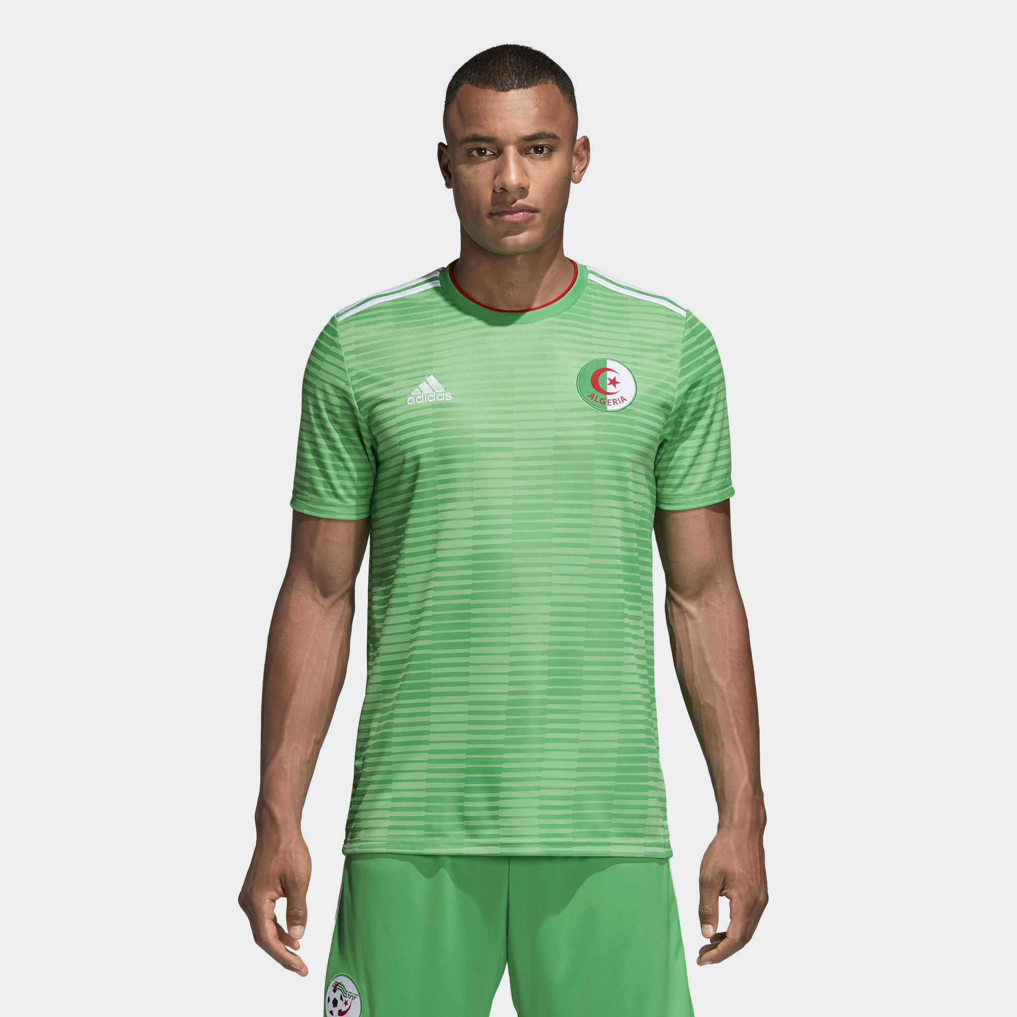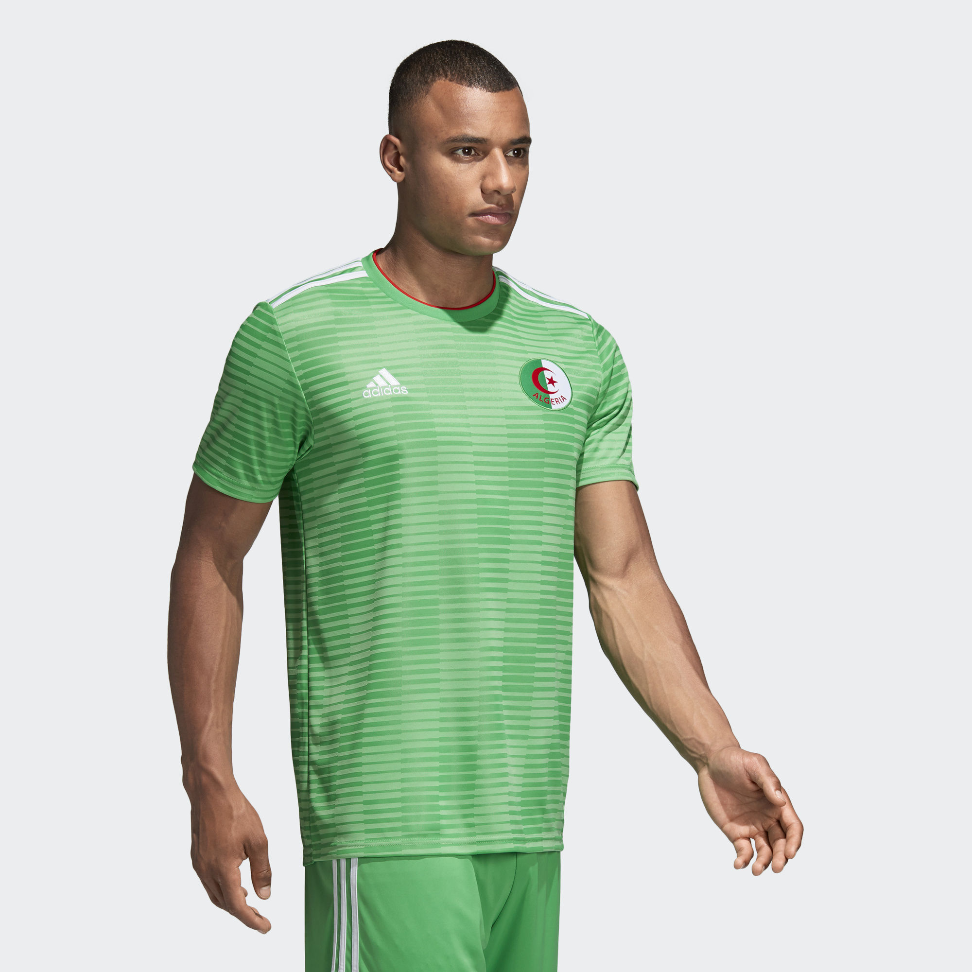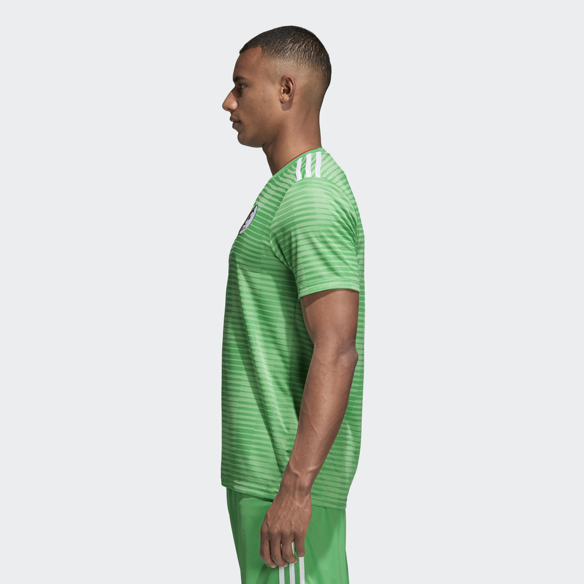 Displaying a fresh take on Algeria's classic green away colours, this Algeria 2018 Adidas Away shirt is based on the one the national team wear when they take on rivals. Made of sweat-wicking Climalite, it features a ribbed crewneck and a woven team badge.