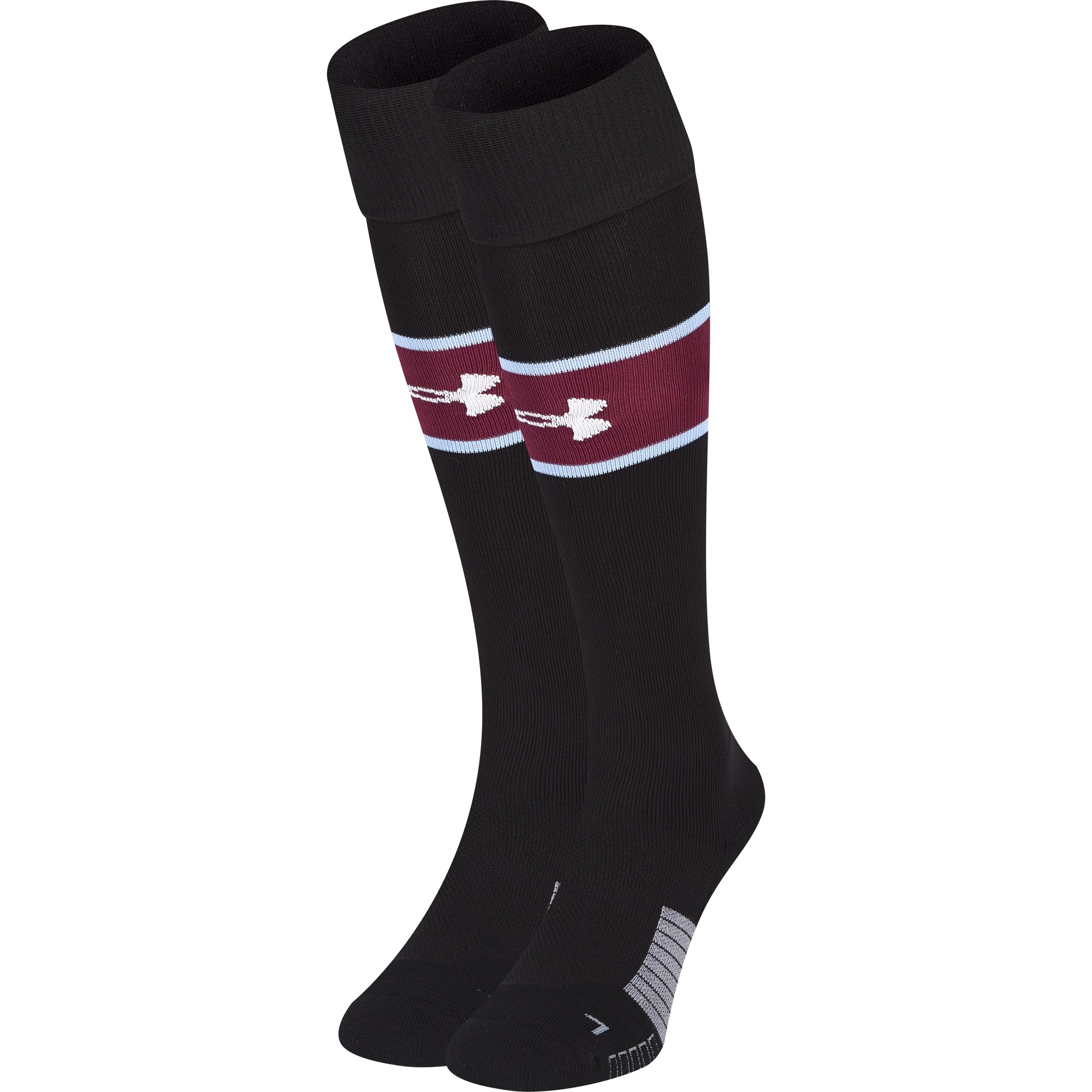 The away shorts include a claret trim, while the socks are black with a claret hoop.