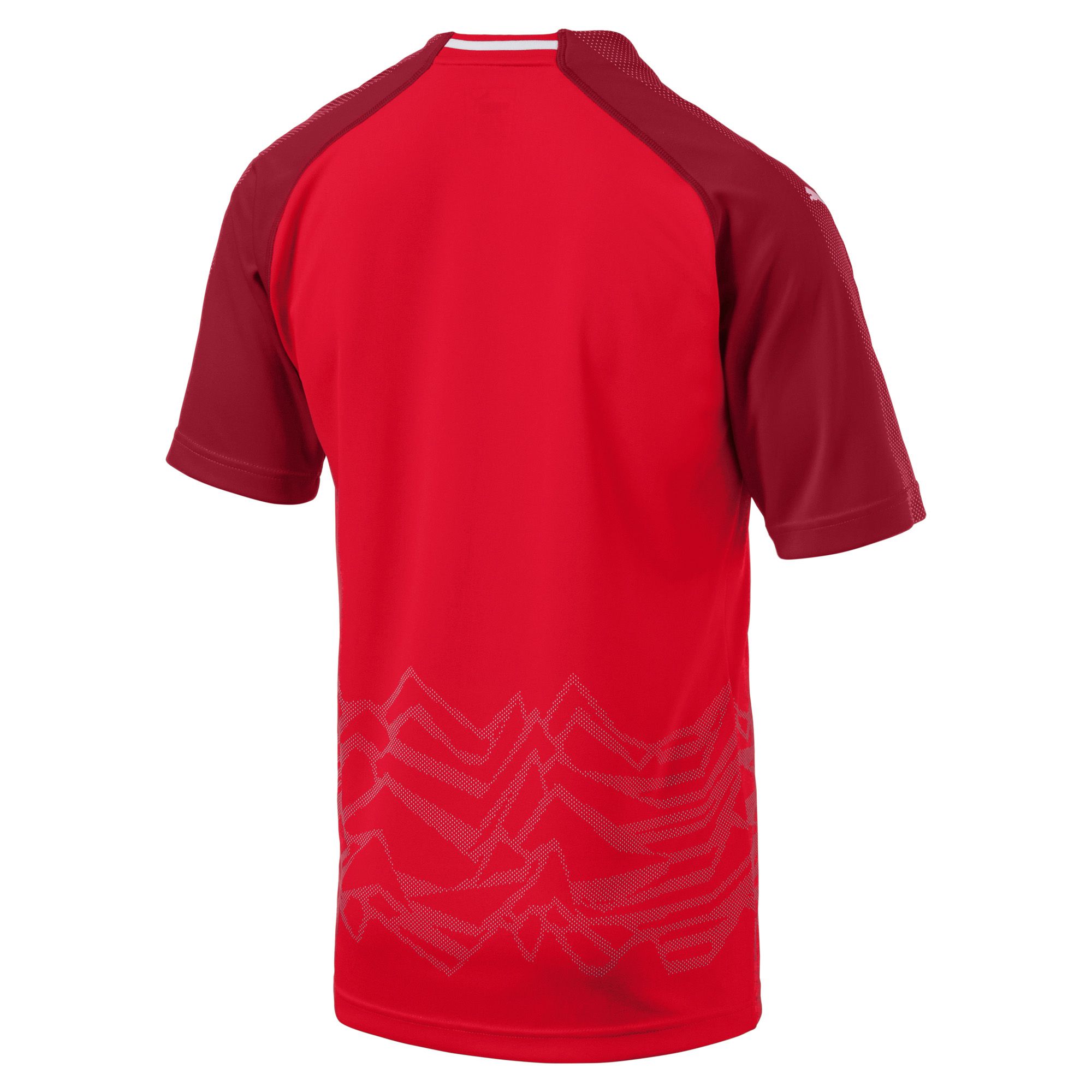 Official Austrian Football Federation woven crest heat applied on left chest, Embroidered Puma Cat Logo on right chest and both sleeves, Engineered jacquard graphic portraying the iconic Austrian mountainous landscape.