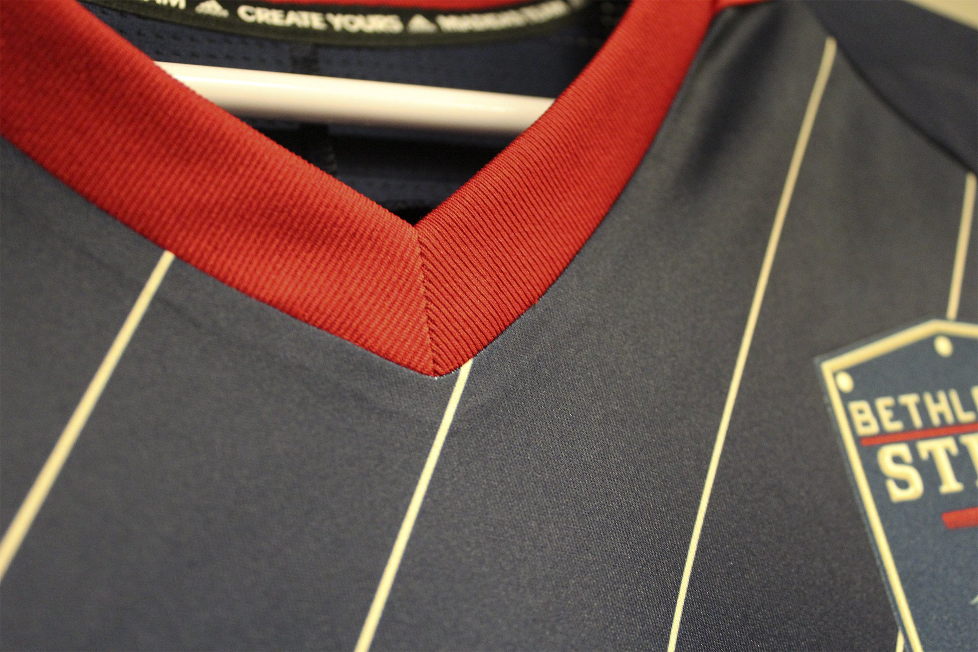 The 2018 jersey brings a more vibrant and fresh look to the historic Steel FC club, adding diagonal gold stripes across the navy kit while maintaining the historic red trim on the neck of the jersey. In addition, Steel FC’s new badge features a more vibrant shade of gold matching the stripes along with an updated Bethlehem “B” in a diamond pattern.