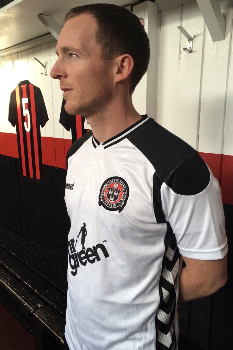 The new 2018 Bohemian FC away jersey a slick white and black design featuring the classic Hummel chevrons, incorporates the Dalymount street sign on the front and "Dublin's originals" on the back.