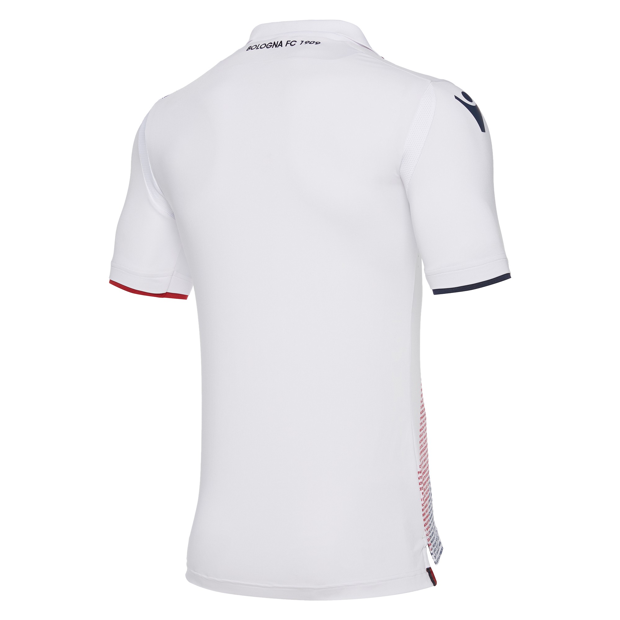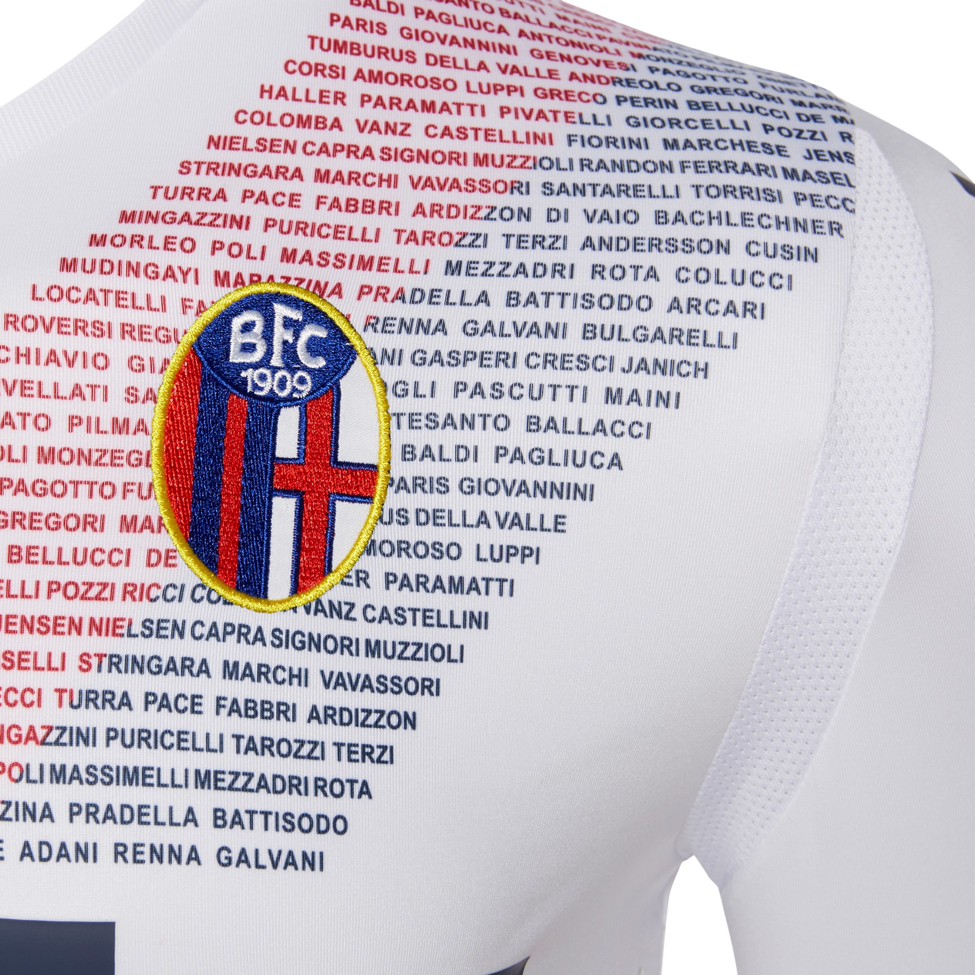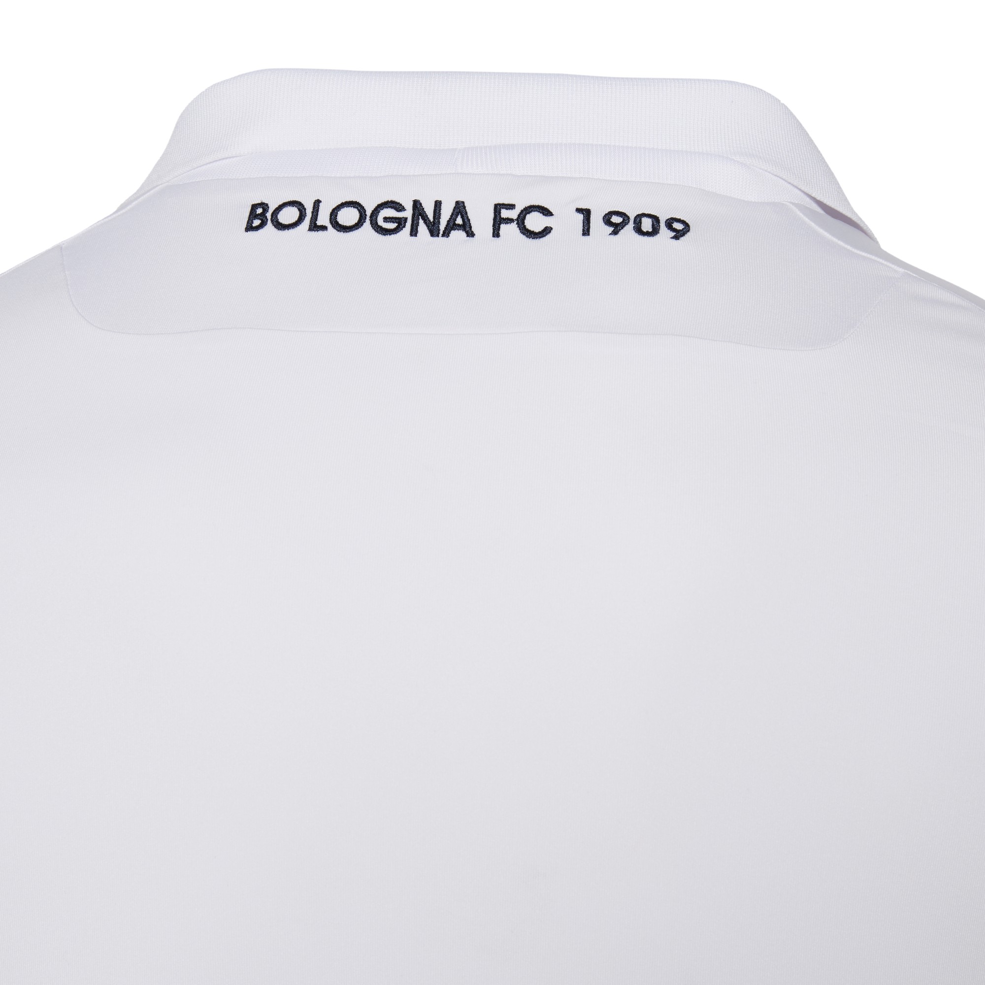 The shirt is white with a ‘rossoblu’ red and blue diagonal band formed by the names of the players who have played the greater amount of games for the club. It is a body-fit shirt with micromesh inserts that ensure breathability and lightness. The collar is a V-neck with a rib finish and on the back is an embroidery of the clubs name: Bologna FC 1909.