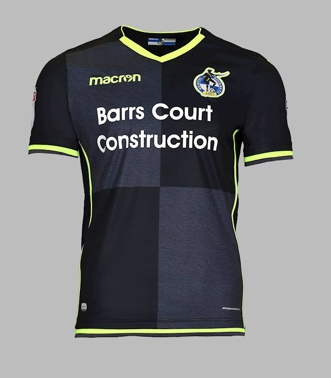 The away kit for the new season sees a departure from the yellow they have used in recent seasons. Instead, the pirates will be wearing a two tone quartered black shirt, with yellow trim and that will be branded with the name of away kit sponsors Barrs Court Construction Ltd.