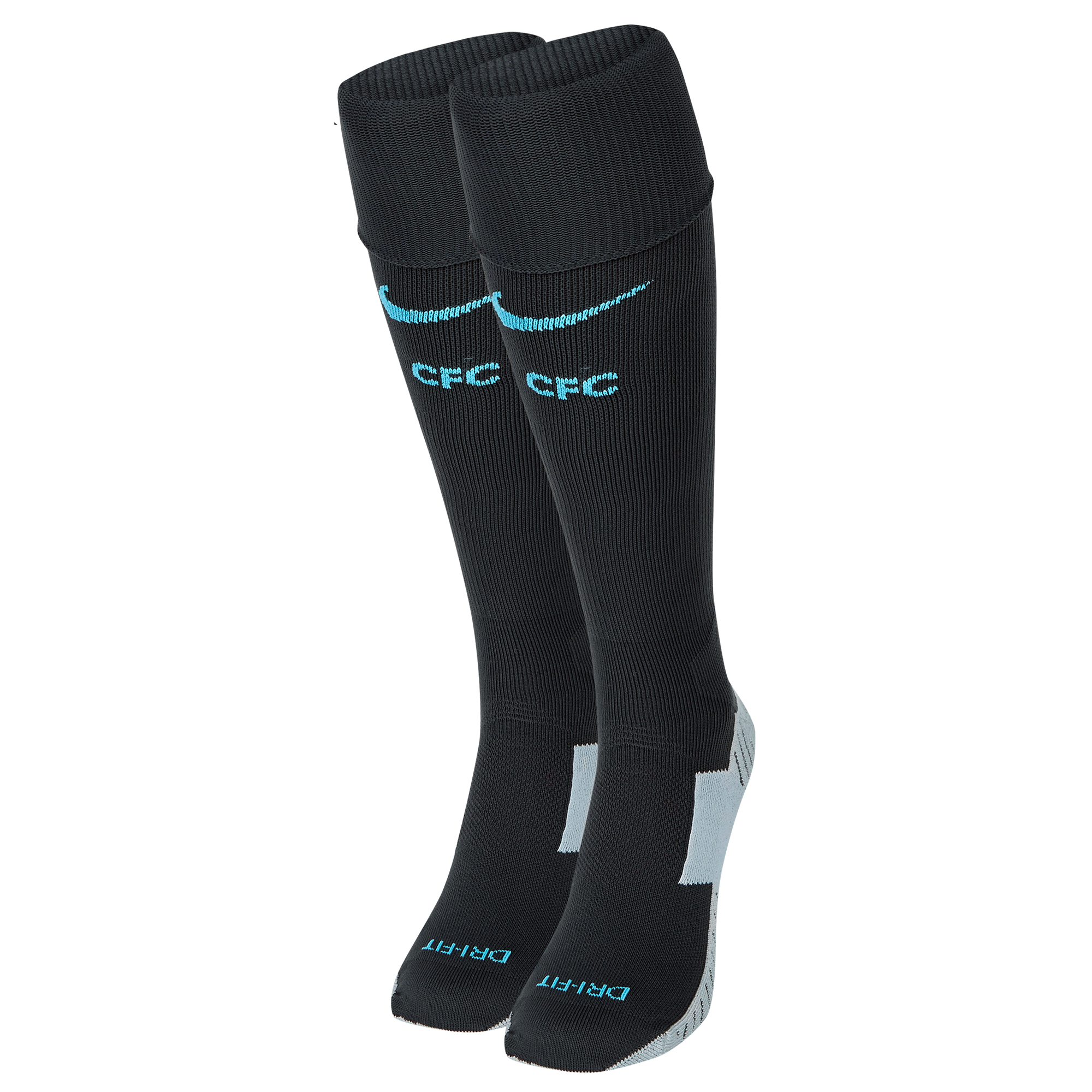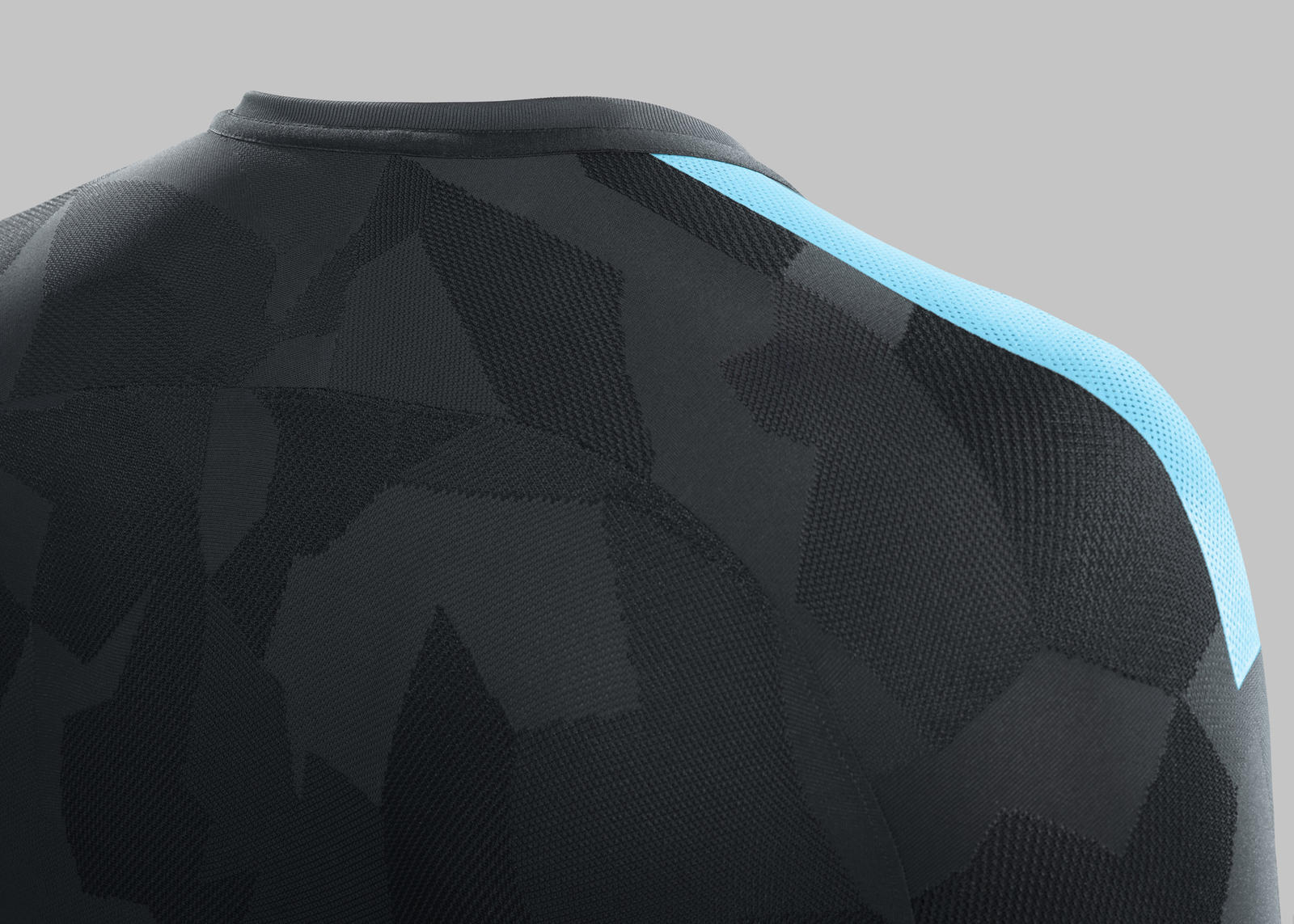 A series of dark greys form the dominant color palate of kit, with a dazzle camo knit design that reflects the growing overlap between the worlds of football and style. Vibrant, eye-catching detailing in a modern electric blue features throughout, from the stripes running along the shoulders and arms to the player names and numbers, as well as the bold “CFC” on the socks.