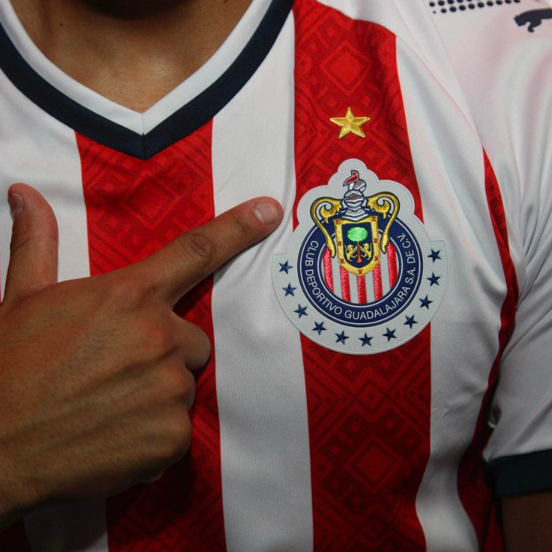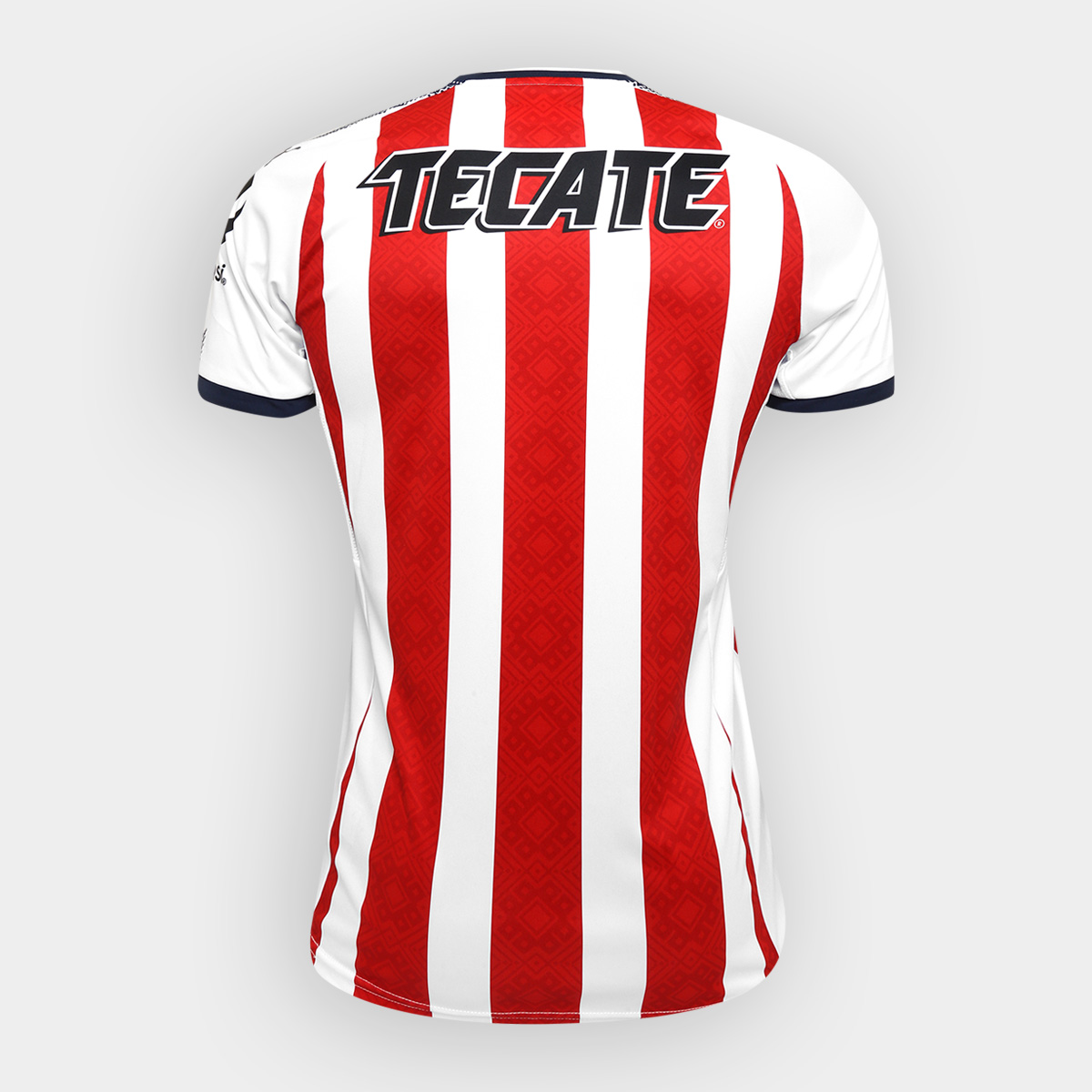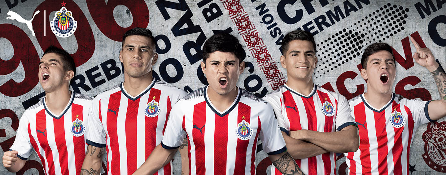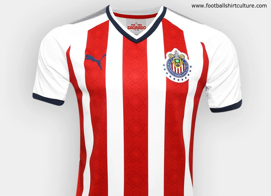 This is the Chivas 2017-18 home football shirt by Puma, which returns to the club’s roots and features red and white stripes on the body.