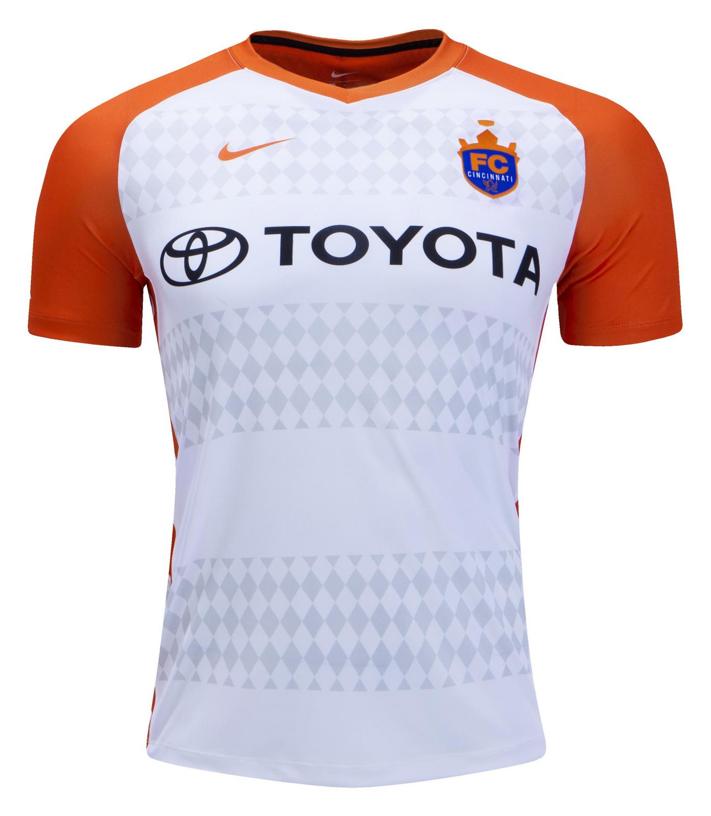 This is the new FC Cincinnati 2018 away football shirt from Nike. An evolution of the club's inaugural away kit, the newest renditions keep the same secondary color palettes; white and orange.