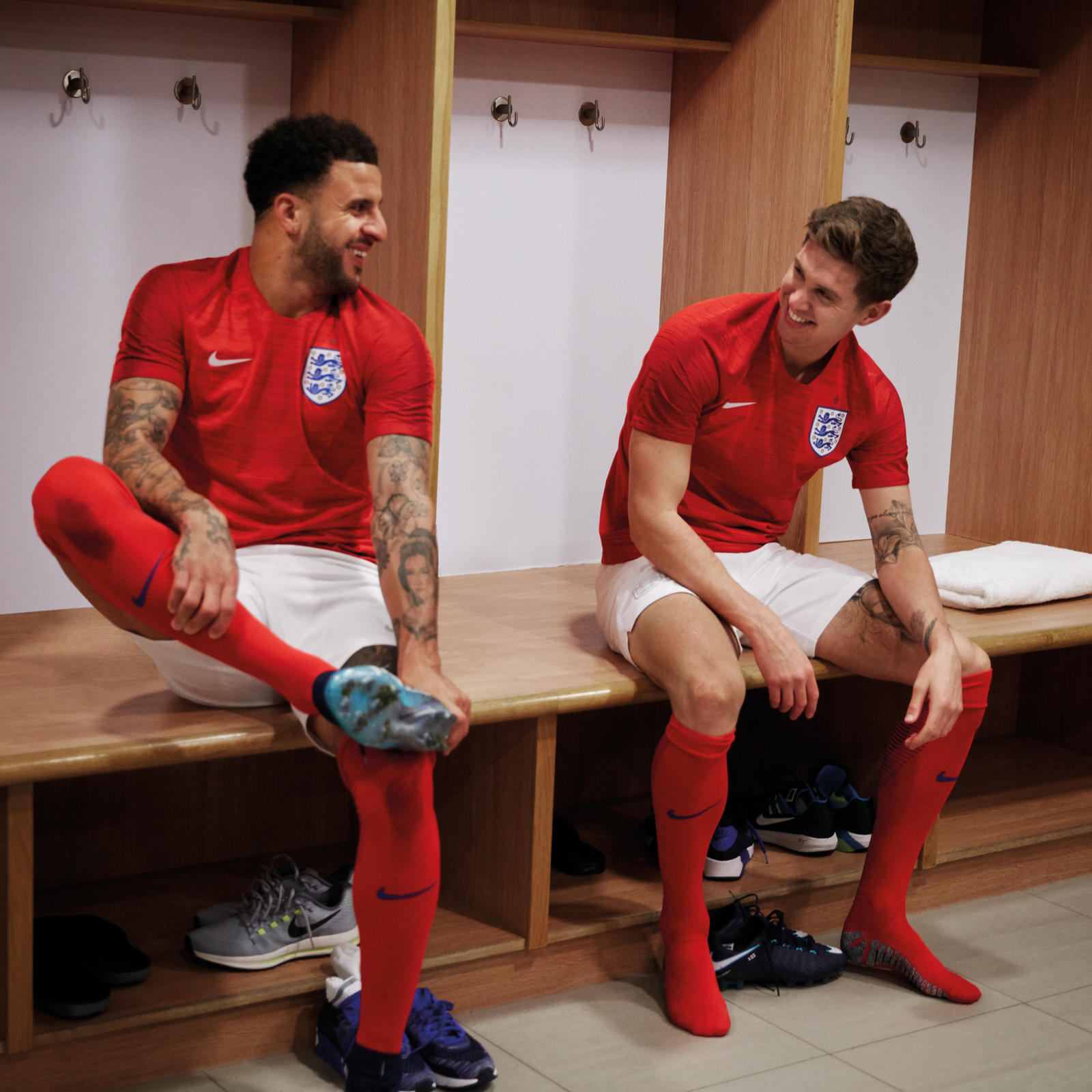 The two-tone stripes evoke speed to reflect the youthful wave of talent that is taking over English football and culture. White shorts with a pure white Swoosh and England crest and red socks finish the look.