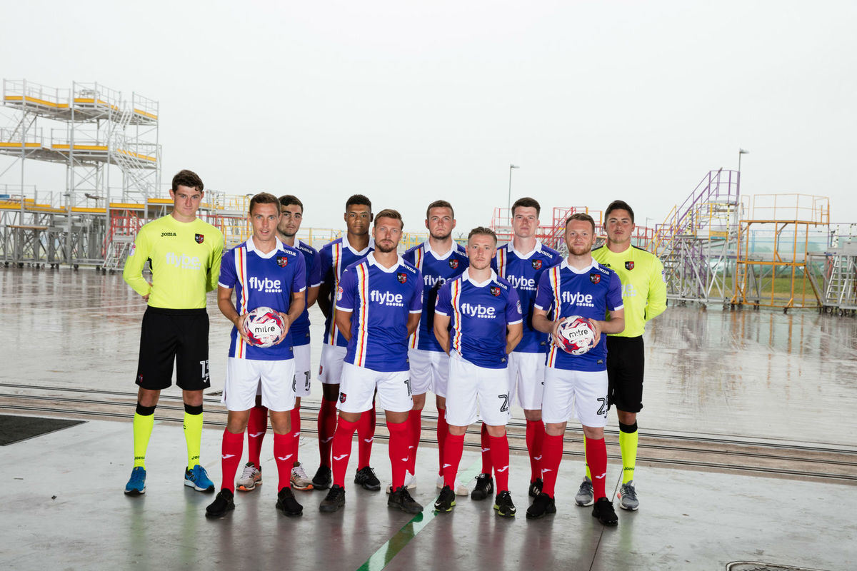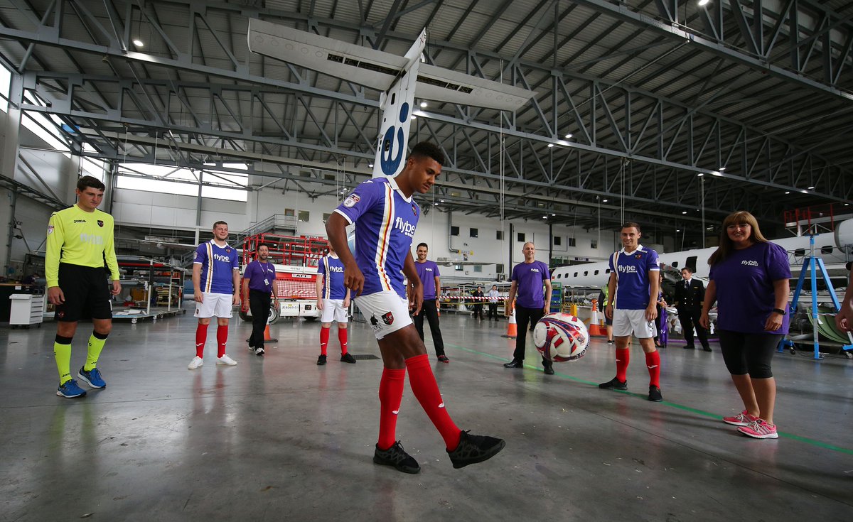 The new shirt features Flybe’s main colour of purple, with a striking white collar and is punctuated with a line of Flybe’s recognisable red, white and yellow stripes. The shirt is paired with white shorts and red socks.