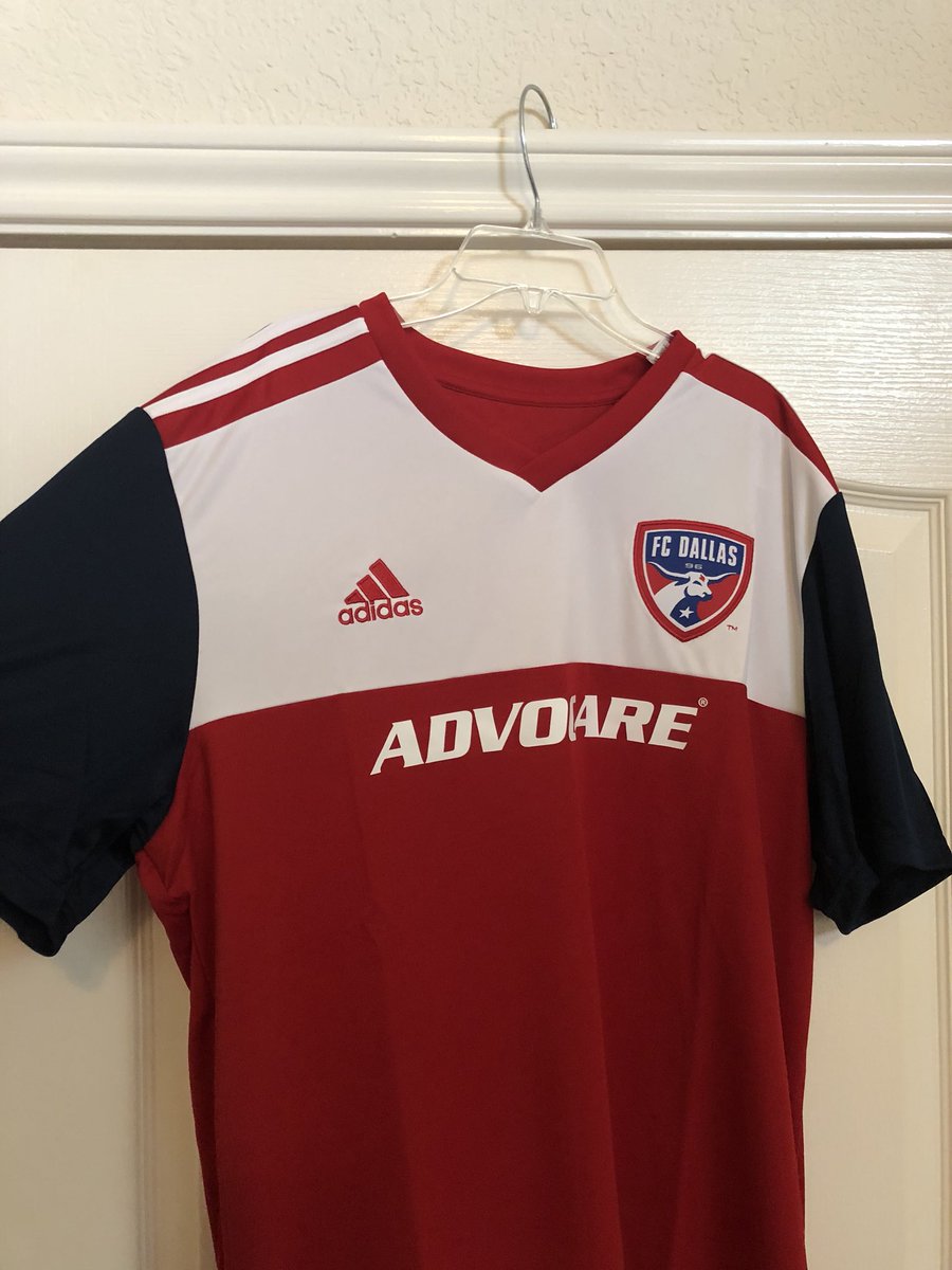 The adidas “Authentic” hologram label on the right front hem identifies the jersey as an authentic adidas garment worn on-pitch by FC Dallas players in a specific season.