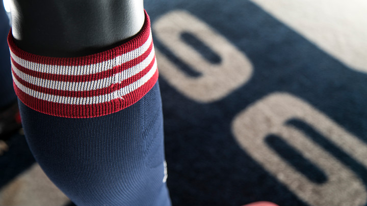 The socks offer a sharp contrast with a bold pop of navy in the leg. The cuff clings to the leg, showcasing striking red bands alternating with three horizontal white hoops.