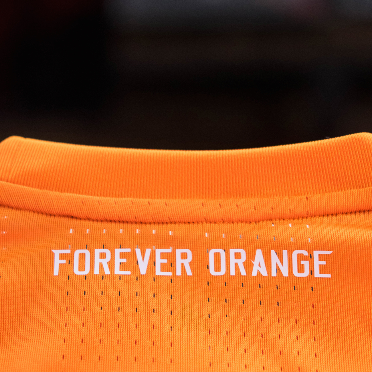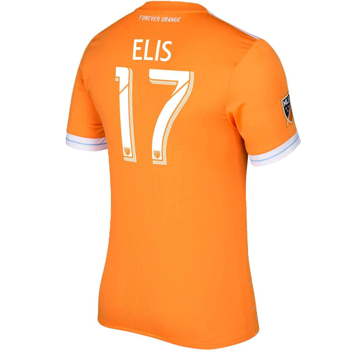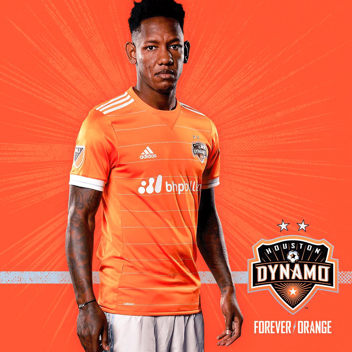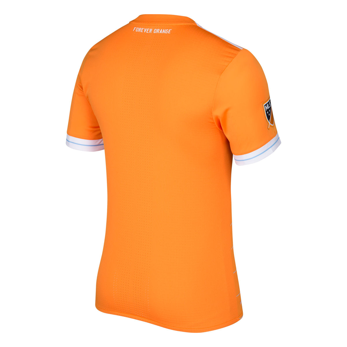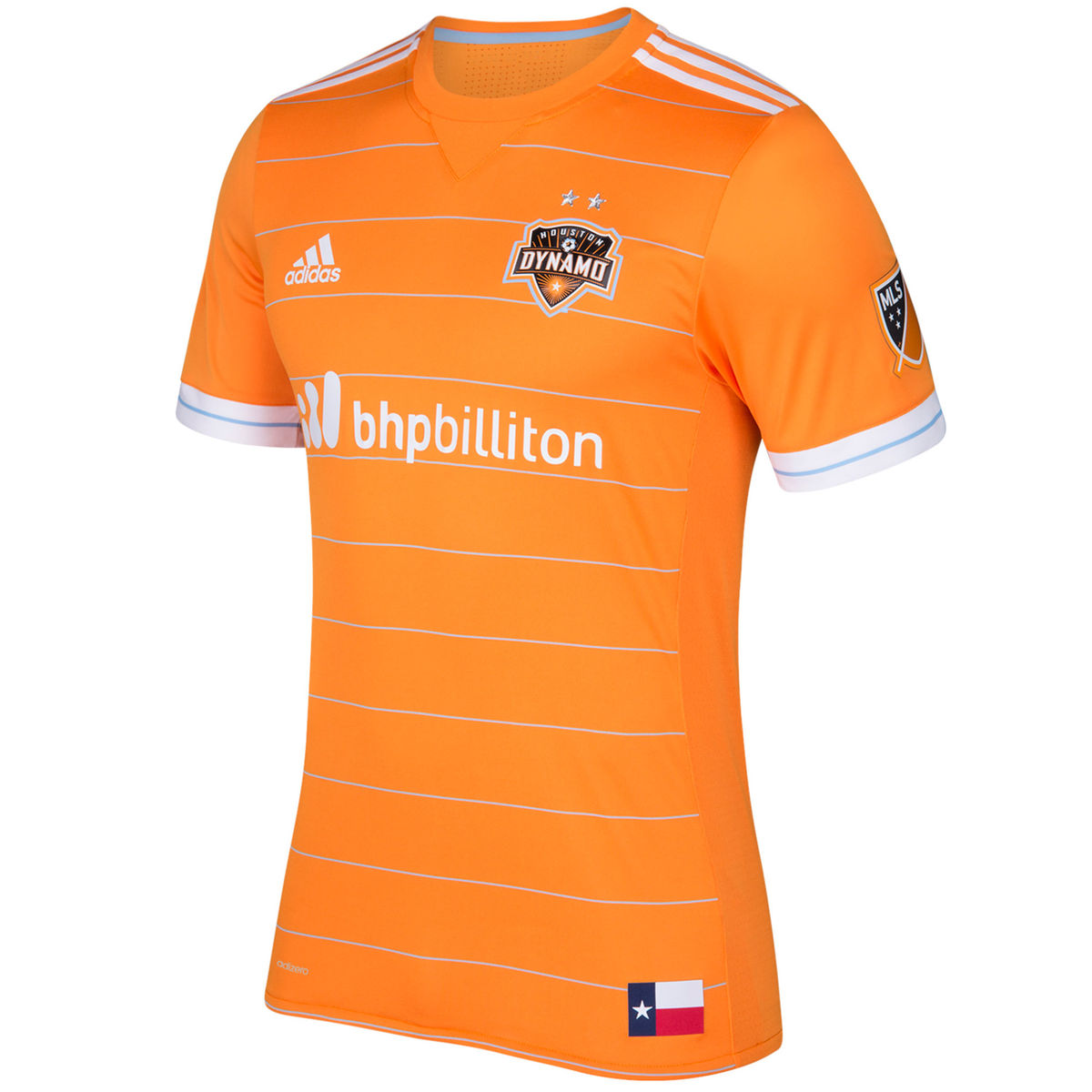 The club motto, “FOREVER ORANGE,” is on the back of the jersey beneath the collar, and the front of the jersey bears the club crest with two silver stars representing the club’s back-to-back MLS Cup wins in 2006 and 2007. The BHP Billiton logo proudly displayed in the middle of the jersey, showcasing the strong relationship between the company and the Dynamo. The Texas flag remains a core element of the Dynamo jersey and is stitched onto the jersey just above the hemline.