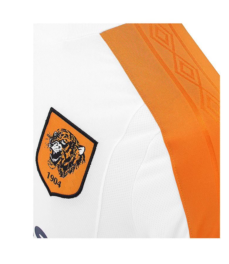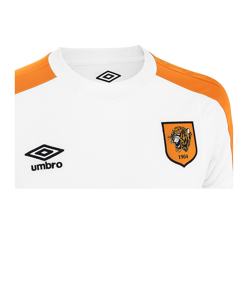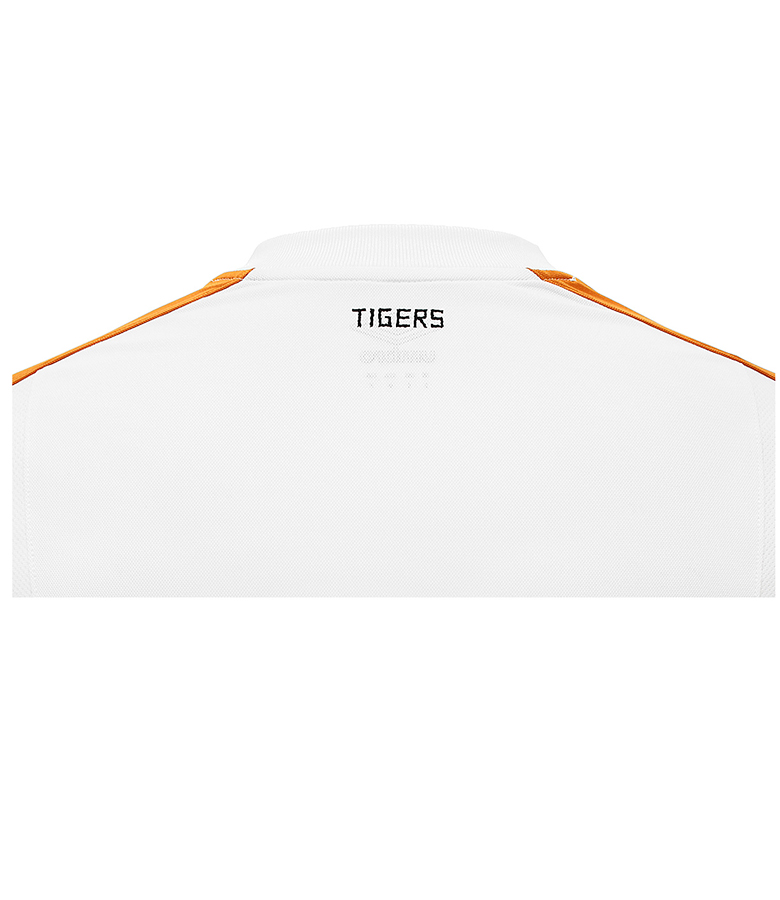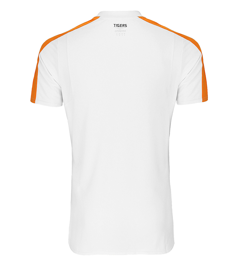 The design is a modern take on the traditional Club style, with predominately white jersey with impactful bold amber matt shine running diamonds on the sleeve and on the reverse of the shirt there is a stylised ‘TIGERS’ wording sign off.