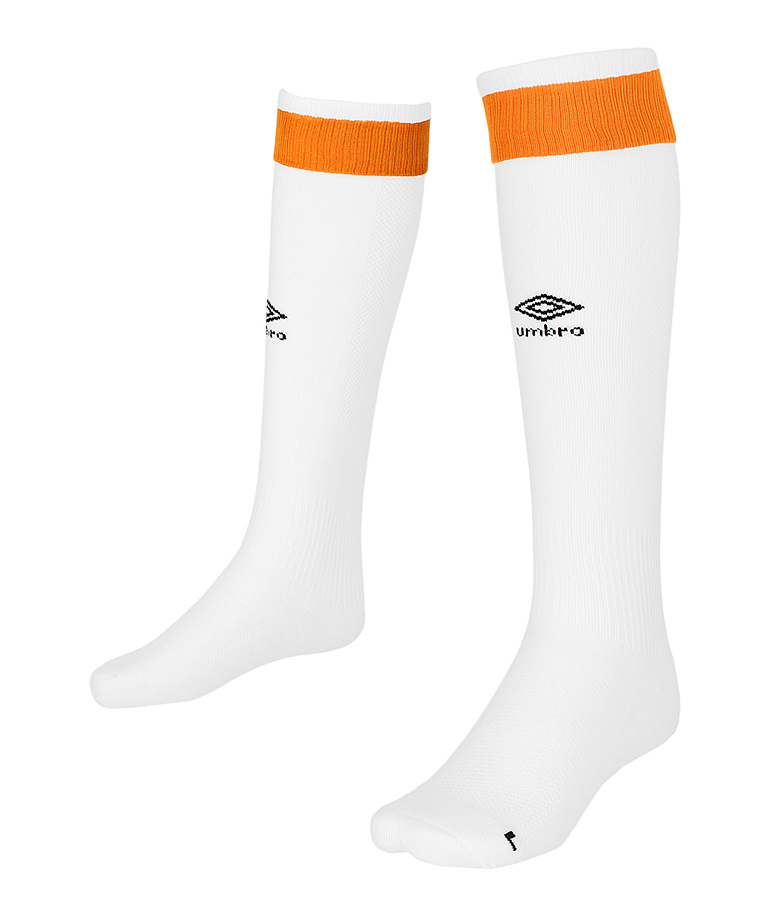 Double welt socks in white feature an amber band and adorned with the double diamond to complete a kit that matches the modern-day footballers’ high levels of performance on the pitch.