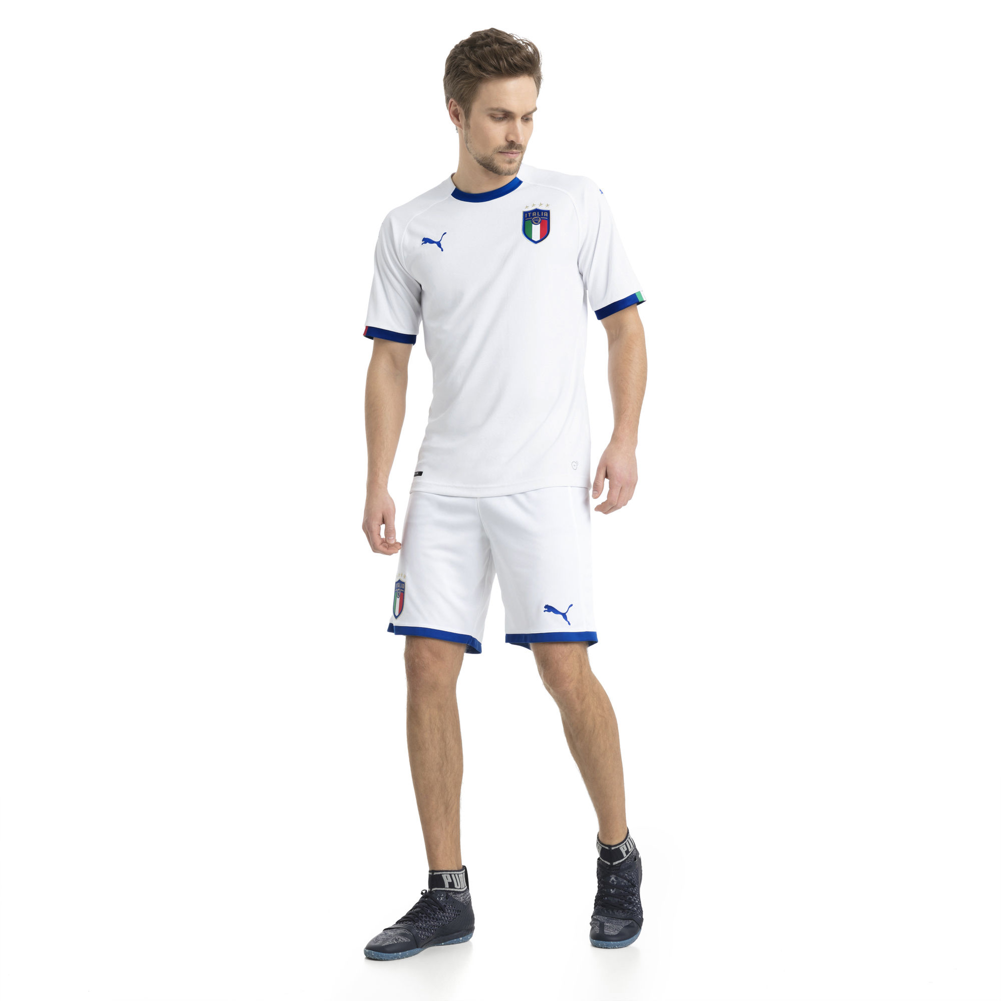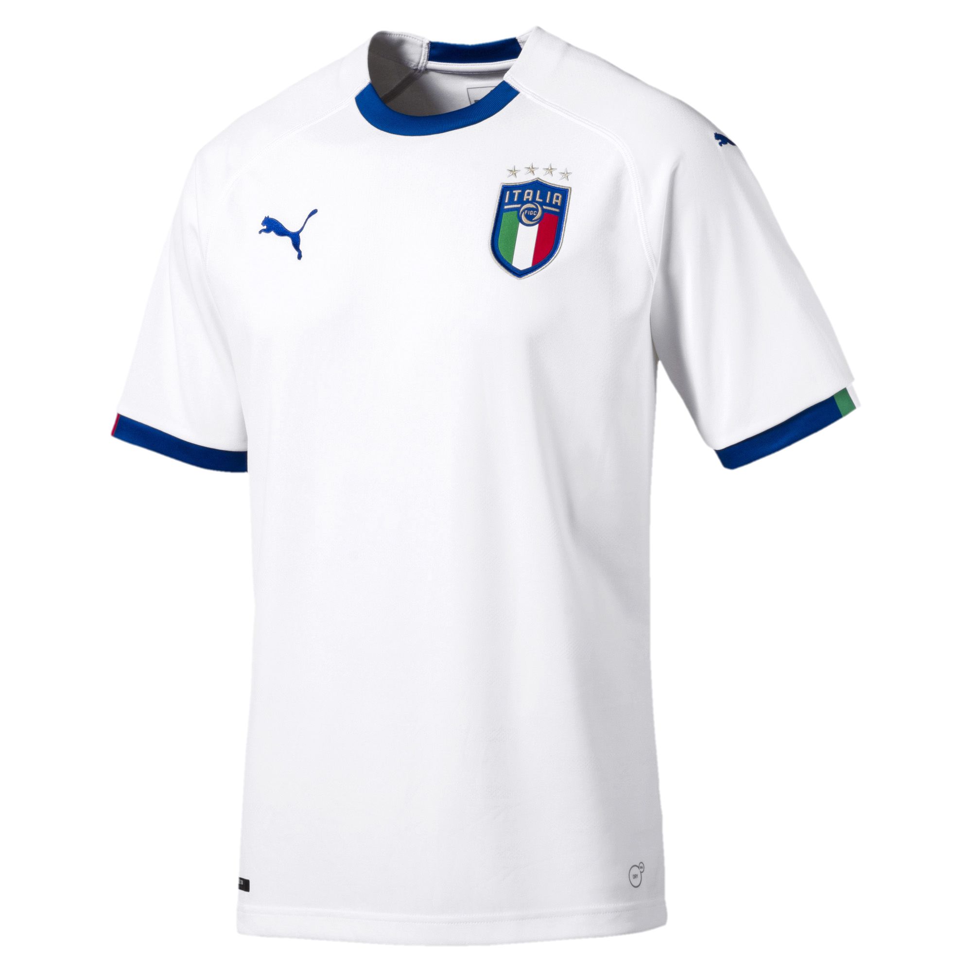 This pure white jersey features the new official FIGC Italian Football Federation woven crest emblazoned across the left chest, accented by embroidered Puma branding on the right chest and sleeve. Flag detailing on the ribbed cuffs and a striking graphic jacquard print complete the look.