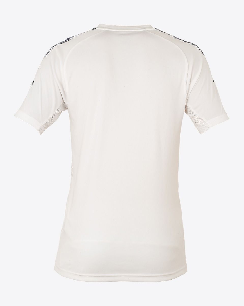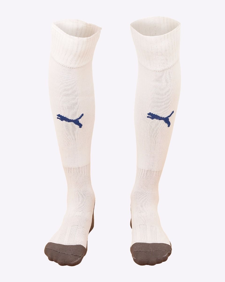 Similarly to the home and away kits, the all-white has dots running from the neck, across the shoulder and down the sleeve, though this time they are blue, rather than gold.