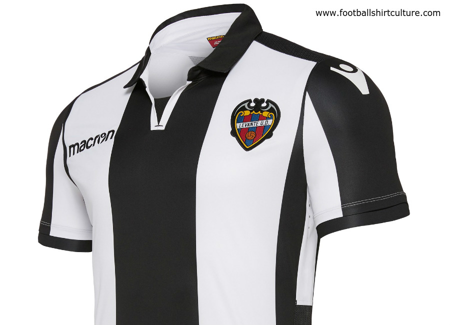 The Levante UD 17/18 away shirt by Macron features vertical stripes in black and white.