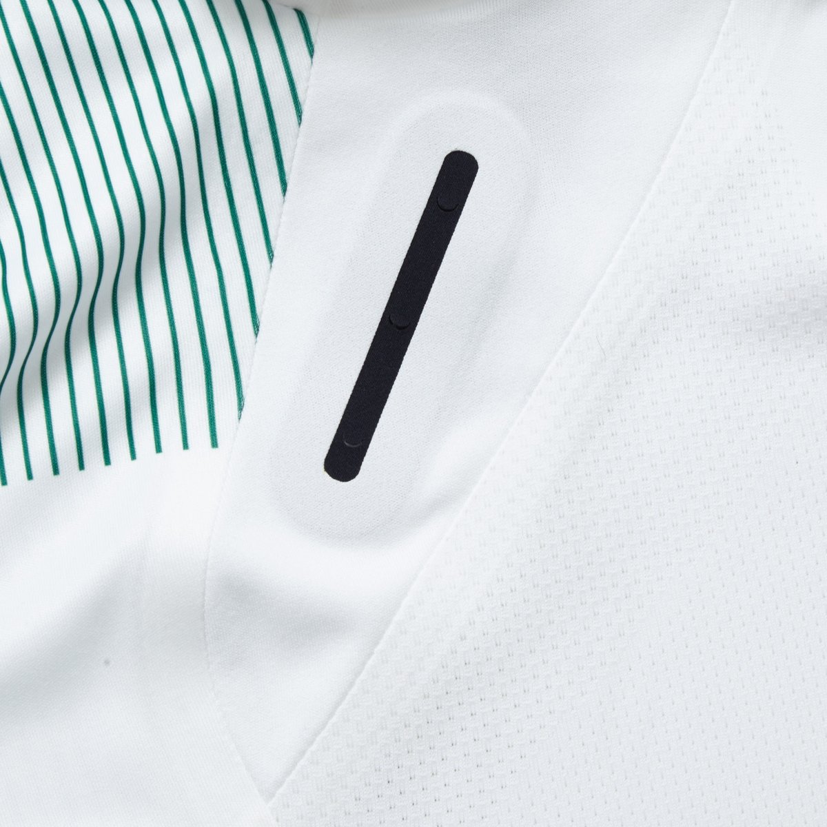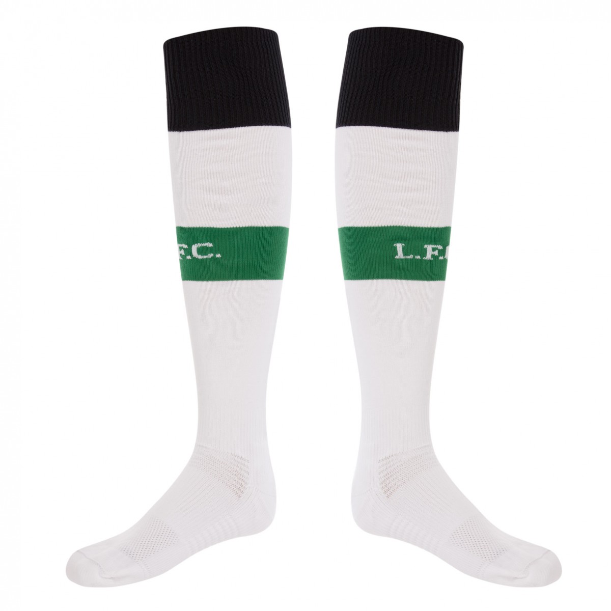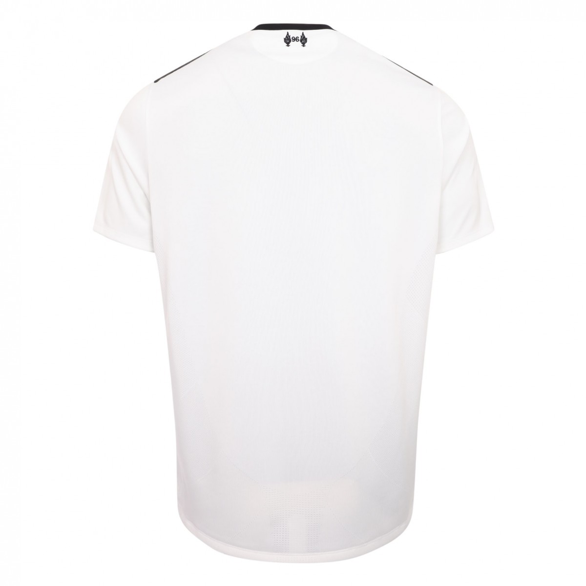 The kit features an embroidered commemorative Liver bird crest and a subtle pin stripe within the design – and is completed by a black collar, black shorts and white socks with a green horizontal stripe and black trim.