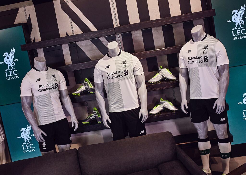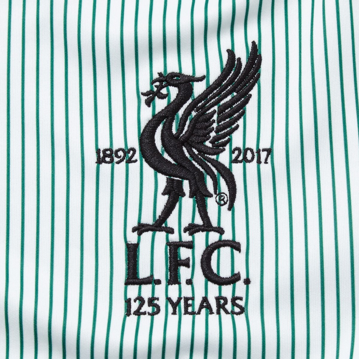 This is the new Liverpool 17/18 away kit by New Balance. The New Balance strip celebrates the club’s 125th anniversary year by continuing the retro-style theme for next season with a quartered green and white shirt that takes inspiration from the team’s first jersey in 1892.