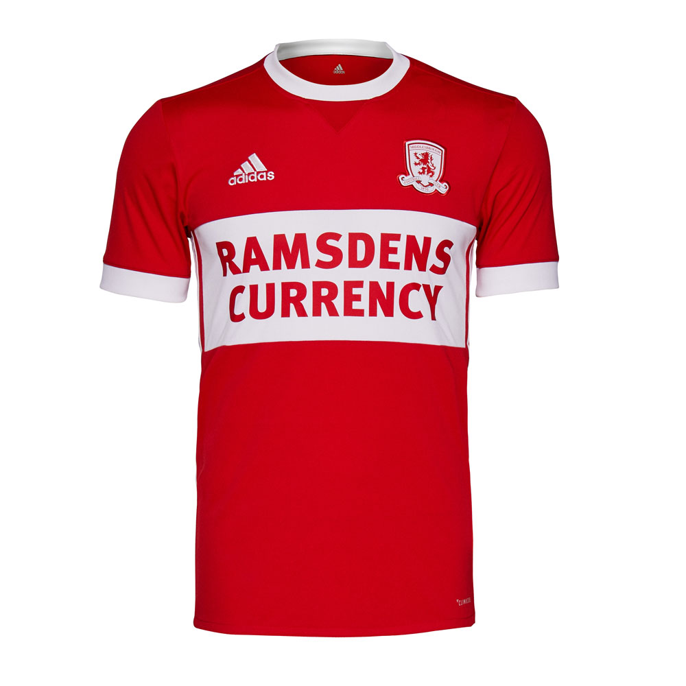 The simple but eye-catching Boro-red design features a round neck and adidas' trademark three-stripe piping, and bears the new-look Ramsdens Currency logo of Boro's Principal Partner, Ramsdens.