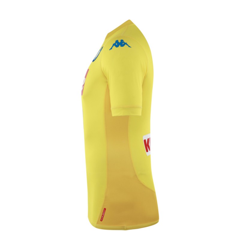 The SSC Napoli Kombat 2017-2018 shirt is made of a polyester stretch fabric with inserts on sides and back. The SSC Napoli, Kappa, Lete and Garofalo logos are placed on the front, the Kimbo logo is featured on the back.