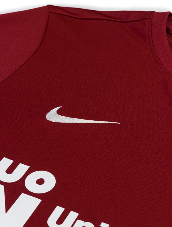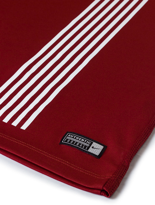 The shirt is mainly claret, but with six vertical white stripes going down from the base of the club crest to the bottom of the shirt. The kit is completed with plain white shorts, and plain claret socks.