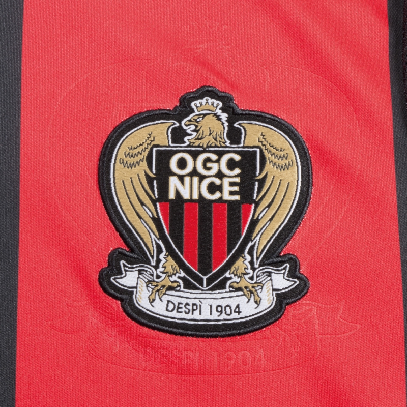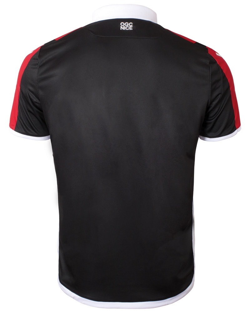The "Home" slim fit shirt is characterised by the traditional black and red stripes while the rear is solid black, interrupted only by two white lateral strips with micromesh inserts to facilitate breathability. The polo style collar has three buttons and ribbed edges while the backneck is completely personalised for OGC Nice.