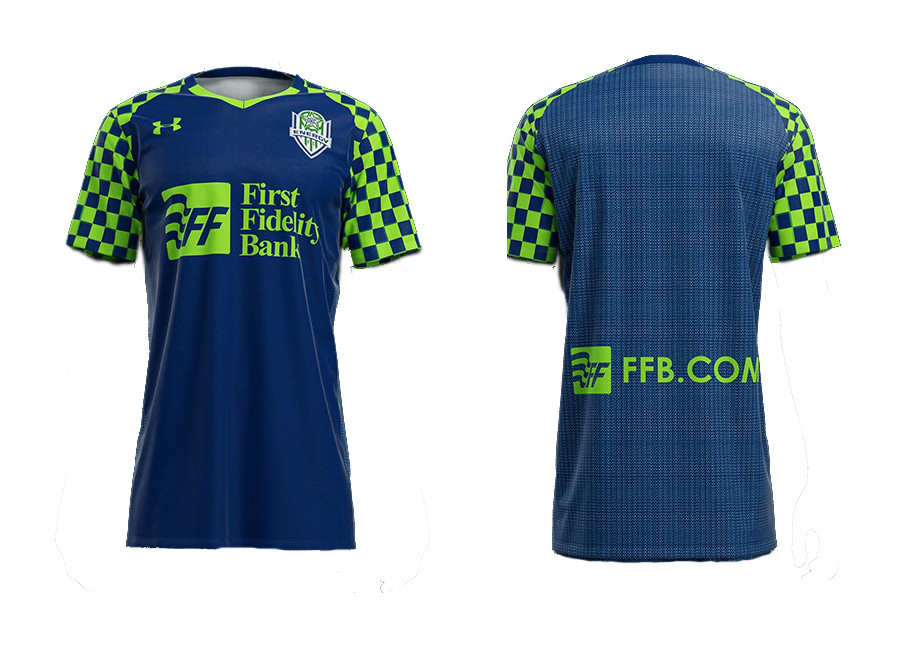 The away kit is has a blue base with a green and blue checkerboard pattern on the sleeve. The Under Armour logo appears on the right chest area of the shirt while the Energy FC logo appears on the left chest.