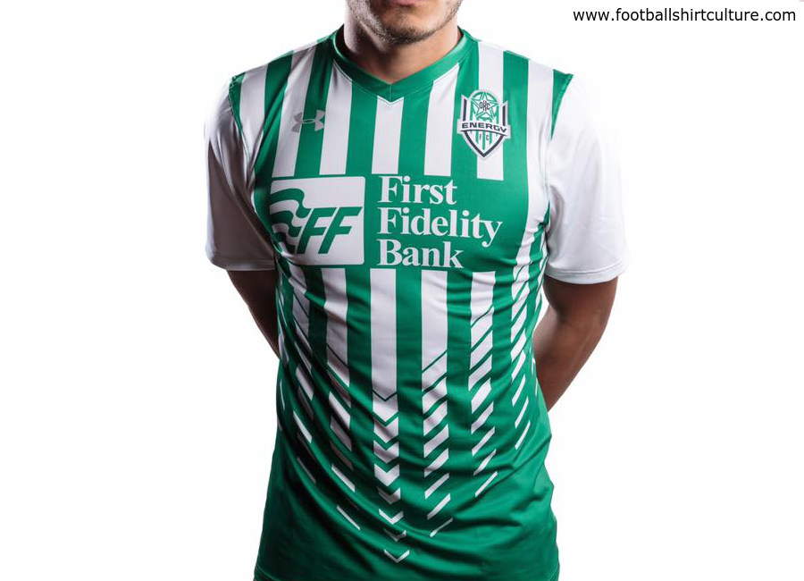 The home kit is a base white jersey with green stripes. The Under Armour logo appears on the right chest area of the shirt while the Energy FC logo appears on the left chest.