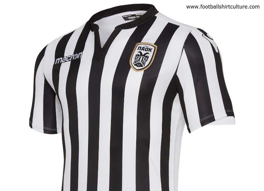 The neck and sleeve cuffs have knitted inserts. On the top right of the front there is a black Macron logo, while the left features the Greek club patch. ‘PAOK FC' is written on the back of the shirt, just under the collar.
