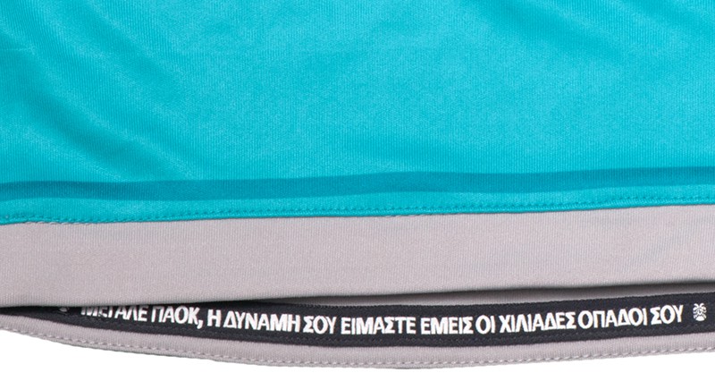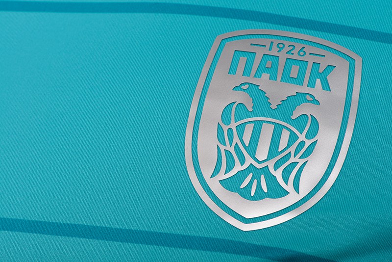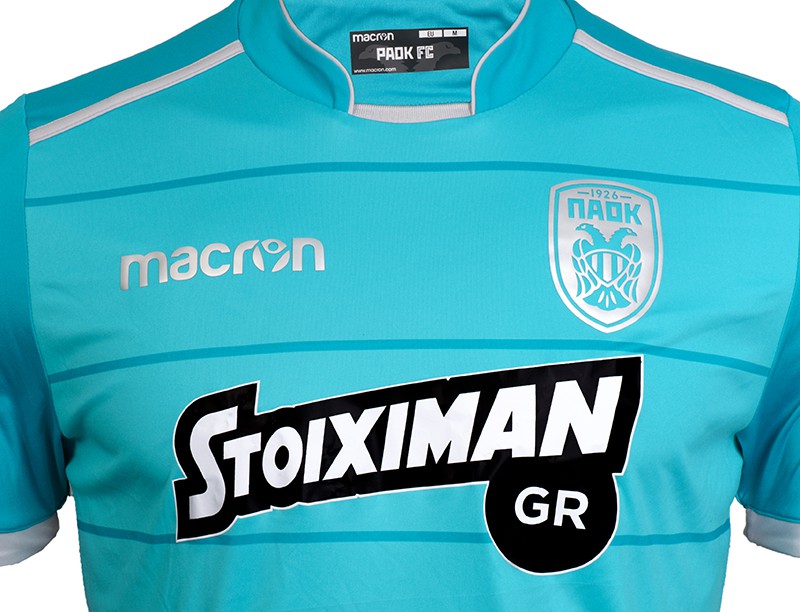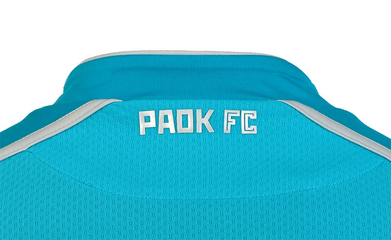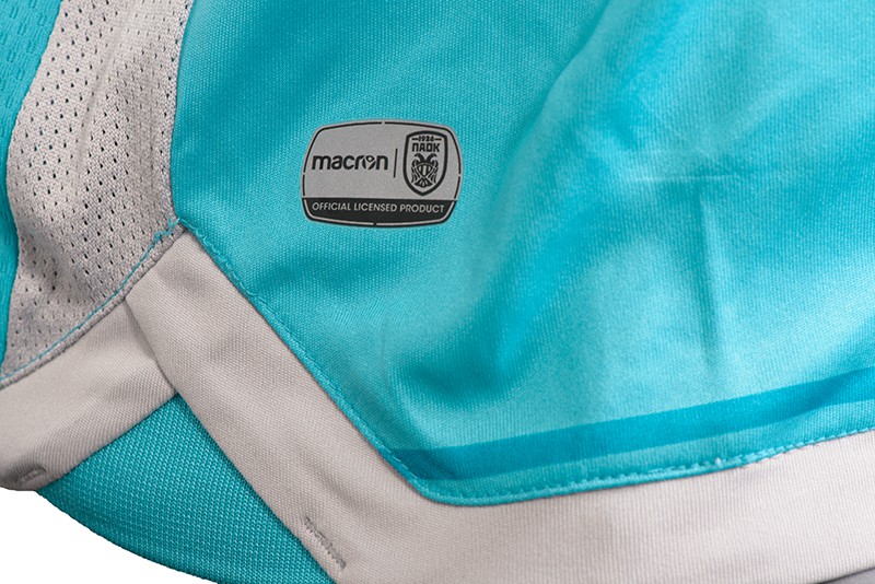 The pale grey Macron logo stands out on the top right-hand side of the front of the shirt, while the left-hand side carries the PAOK FC silicone patch, in pale grey and pale blue.