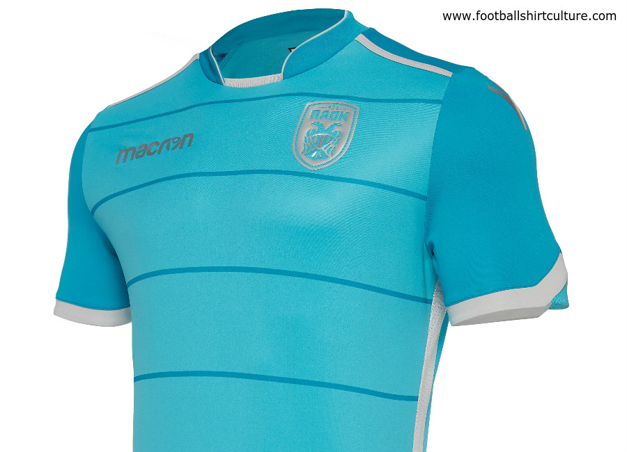 The pale grey Macron logo stands out on the top right-hand side of the front of the shirt, while the left-hand side carries the PAOK FC silicone patch, in pale grey and pale blue.