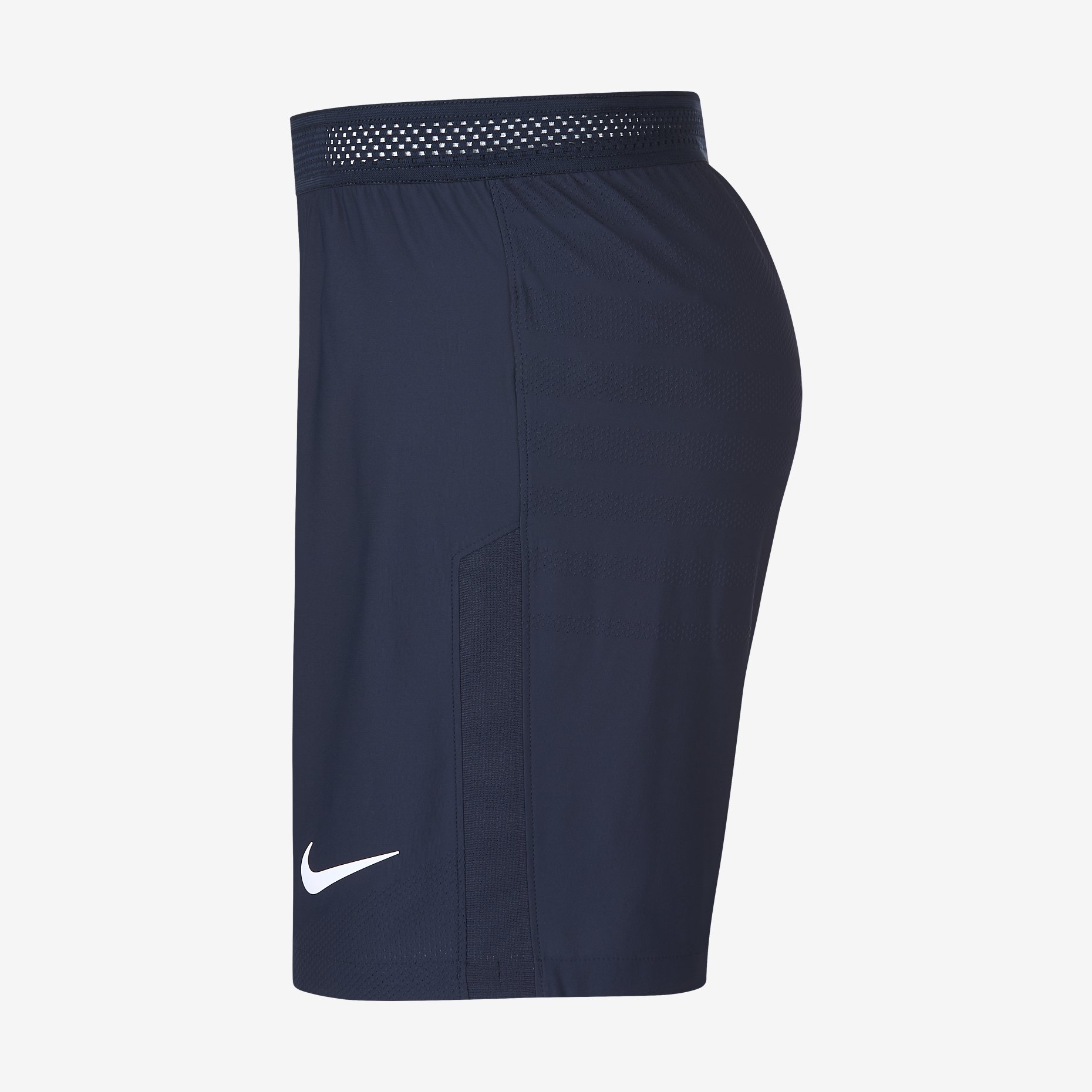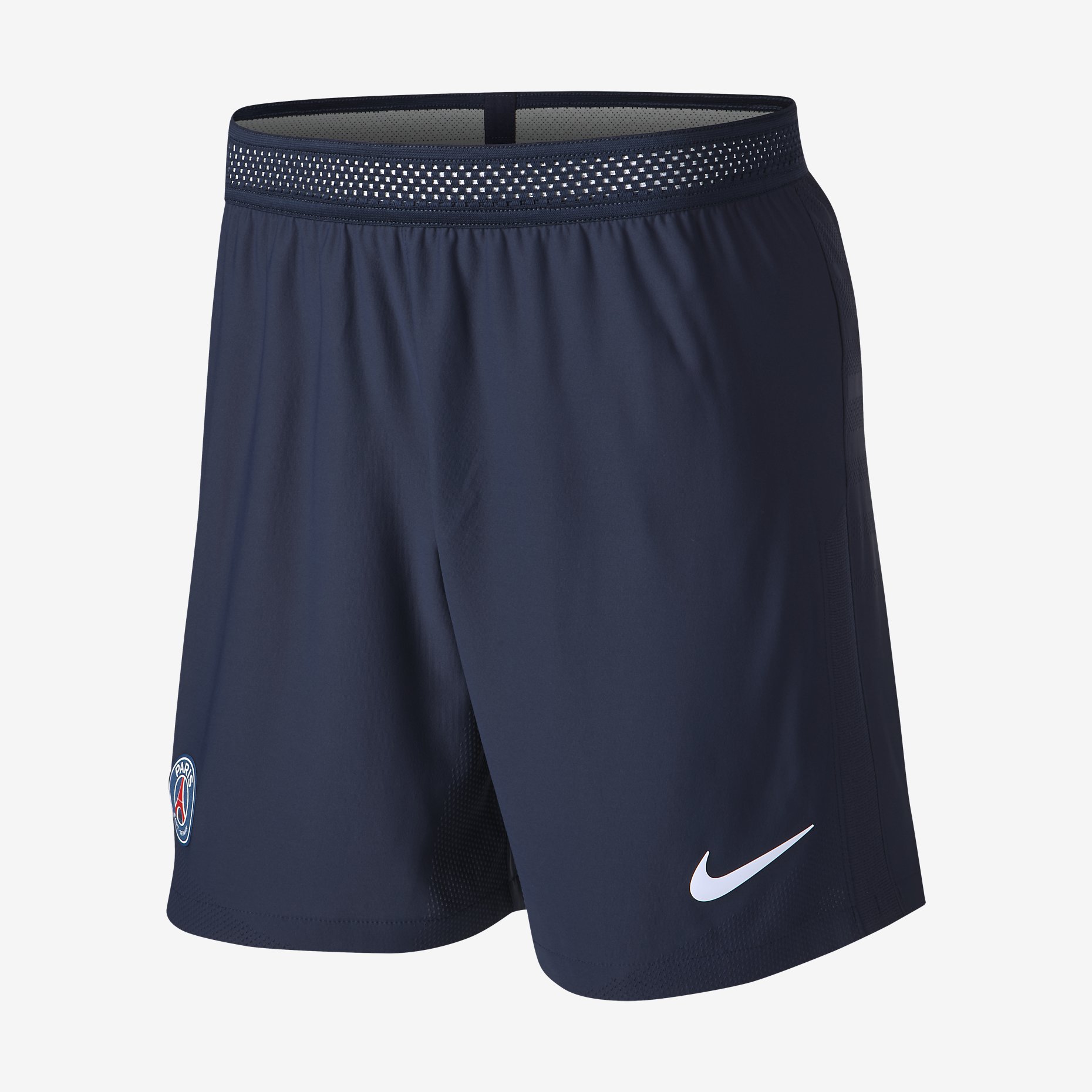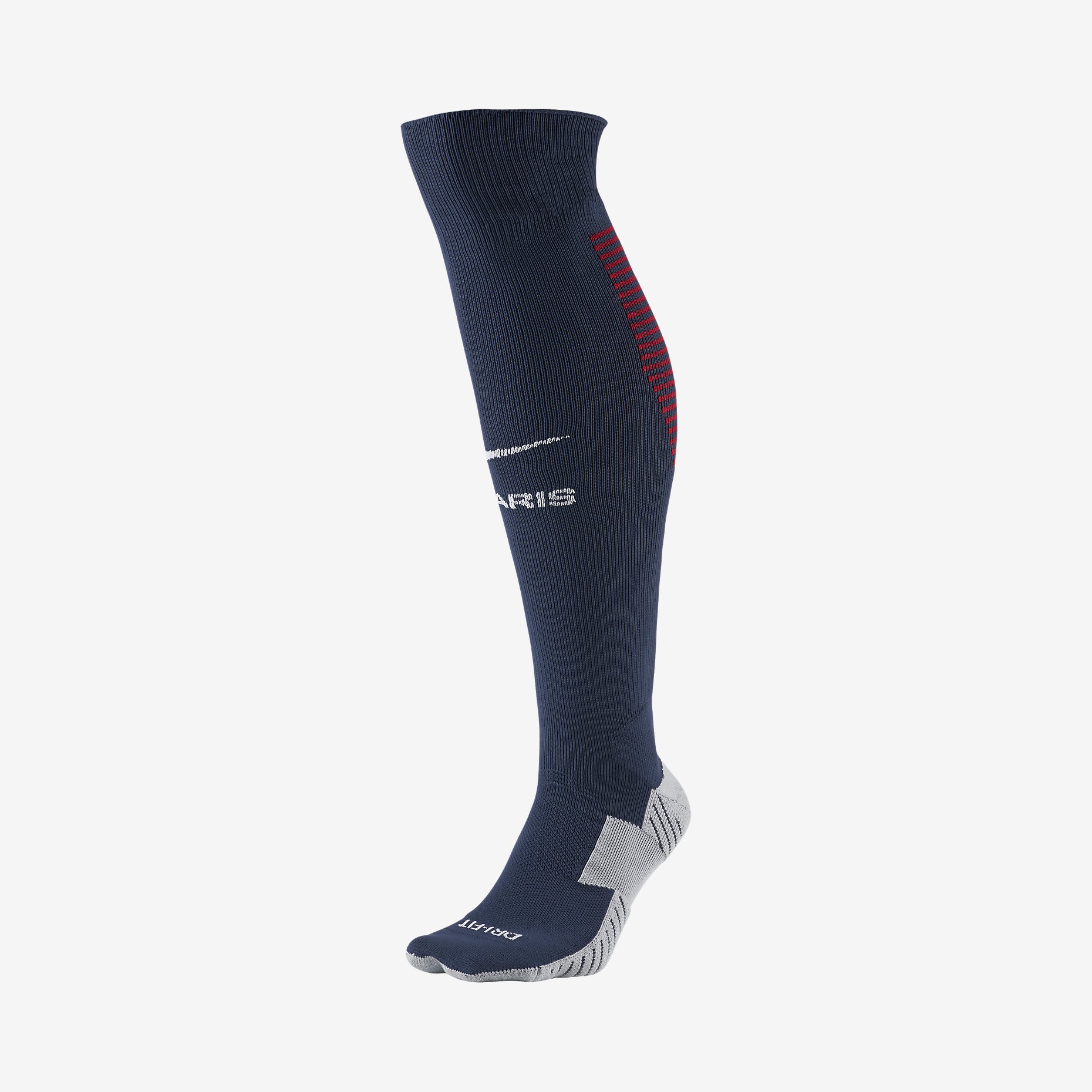 Blue socks, incorporating Nike Grip technology, feature “Paris” in white on the front and a distinctive red linear graphic on the back of the calf, showcasing the club's traditional secondary color and accentuate speed.
