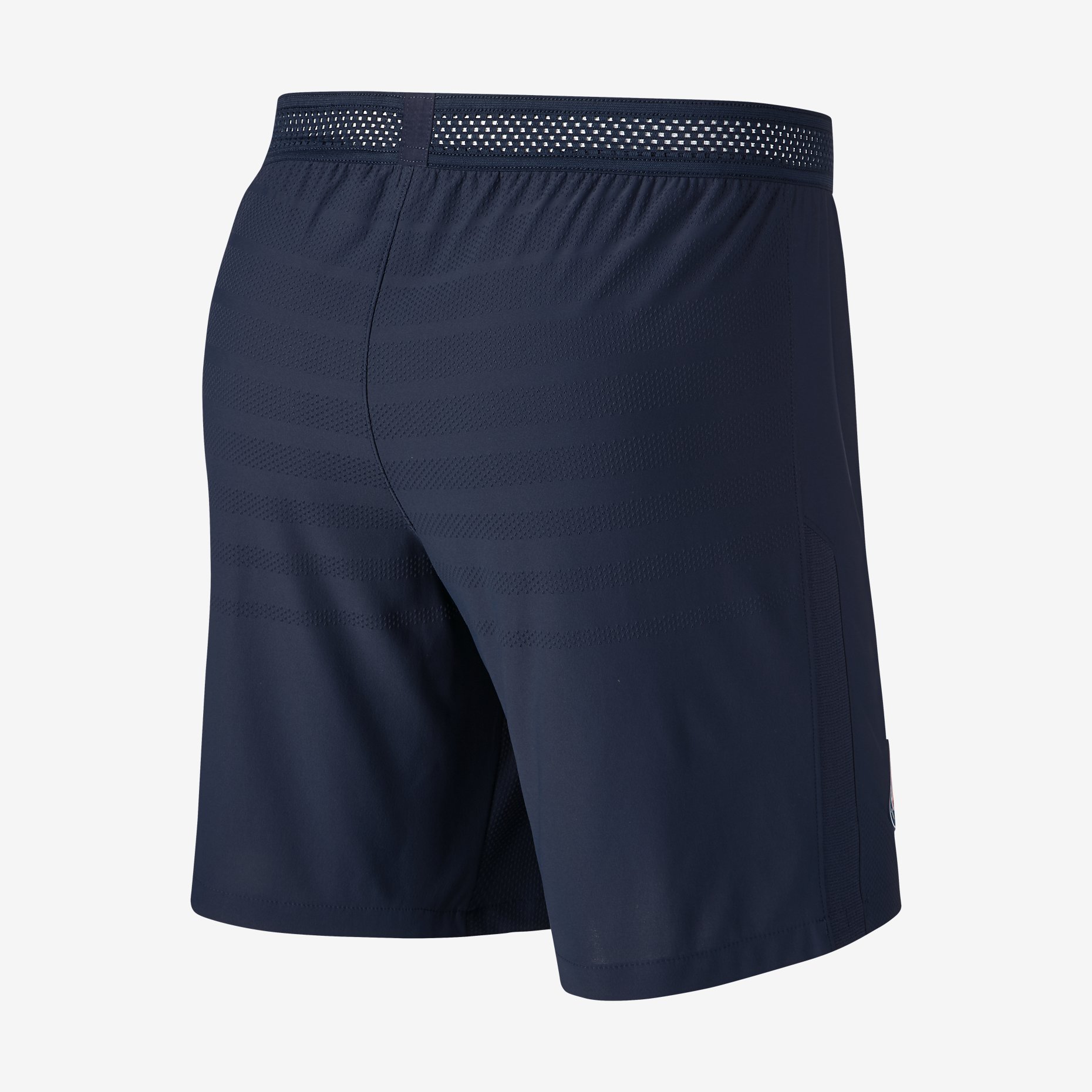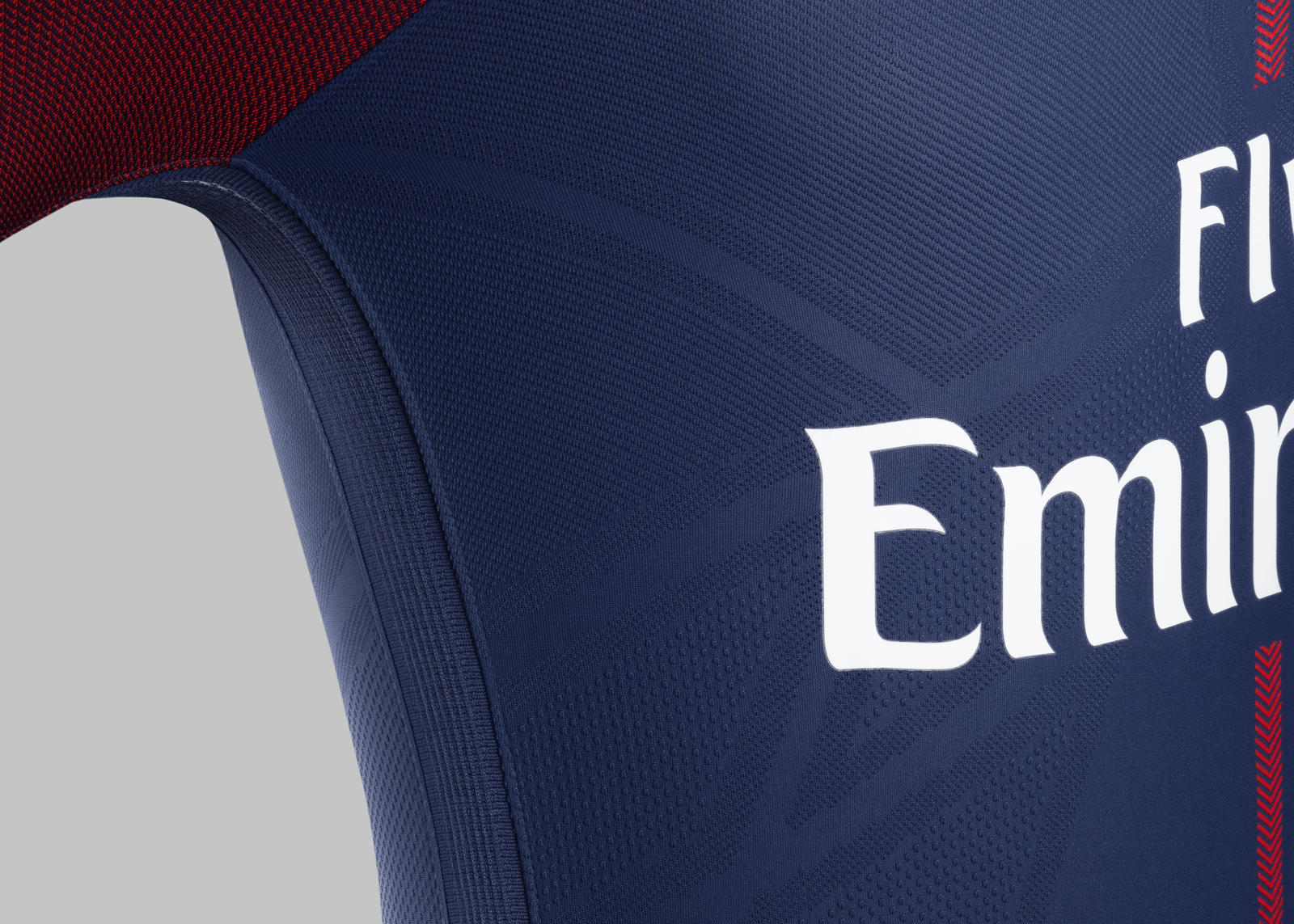 The look is highlighted by the jersey’s midnight blue torso with reinvented club stripe — a thin linear red chevron running from top to bottom. Detailing inspired by the club’s history and culture is evident on the collar, partially defined by an elegant red, white and blue stripe around the neck line, and embedded with the word "Paris" at the back. On the inside of the shirt, the words “Ici C’est Paris” remind of inner club pride.