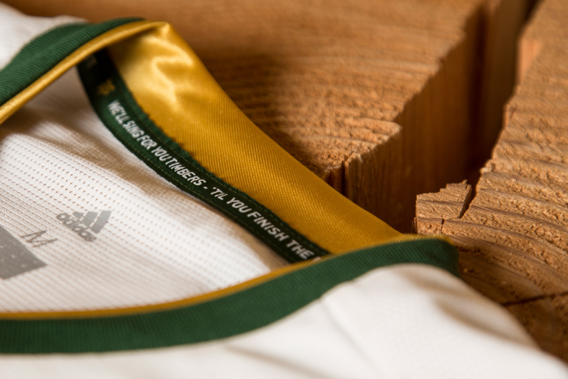 On the inside neck tape are the timbers army chant lyrics: “We’ll sing for you timbers – ‘Til you finish the fight”