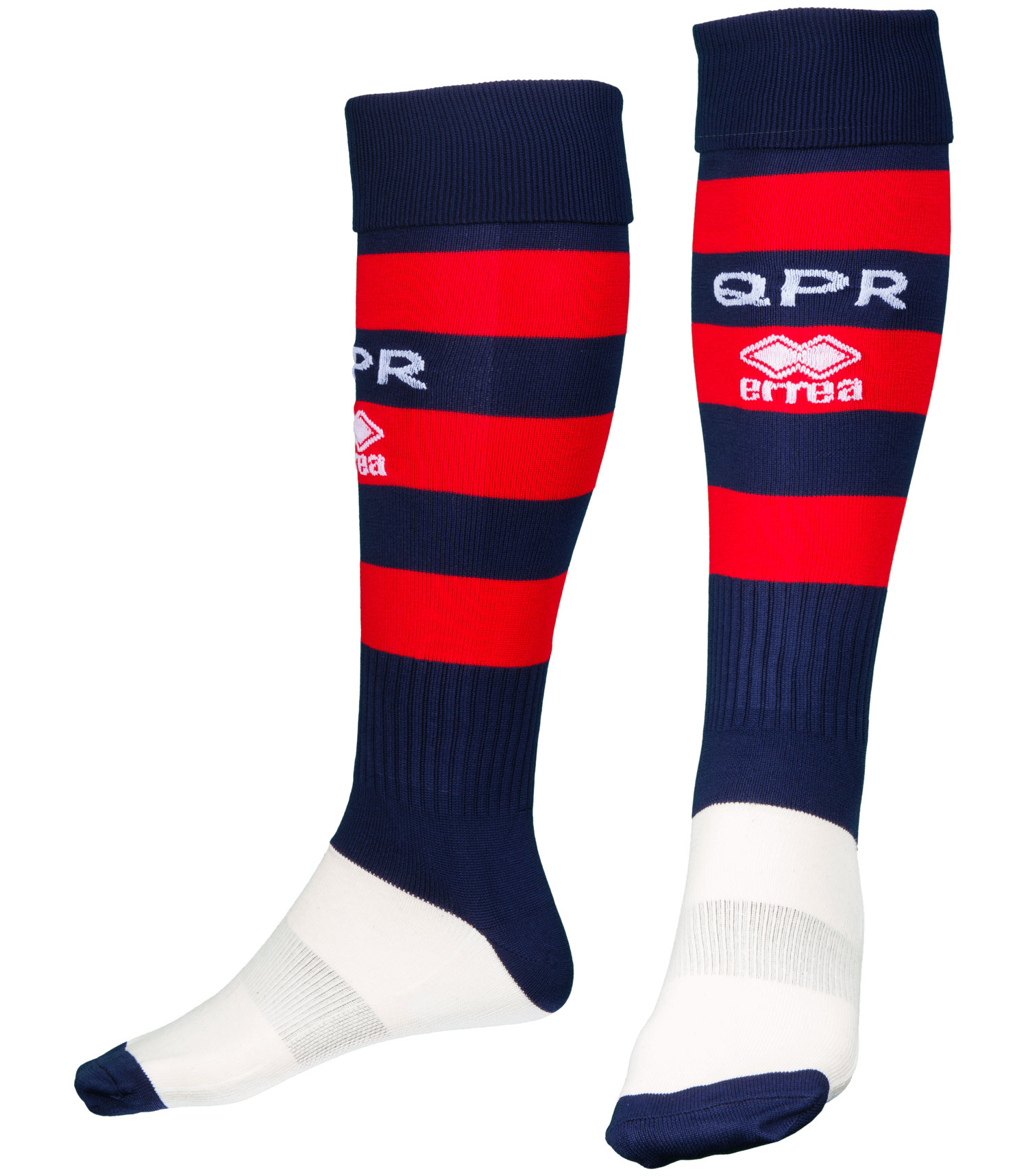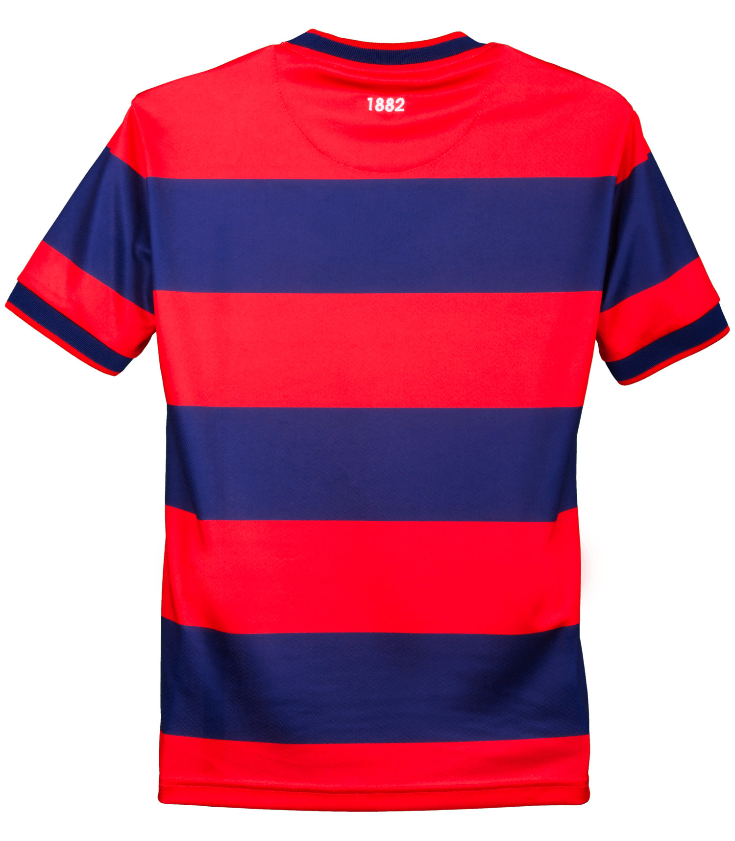 The shirt, in highly breathable stretch fabric, has a round neck and semi-close fit. The shorts are in plain colours, while the hoops continue on the socks.