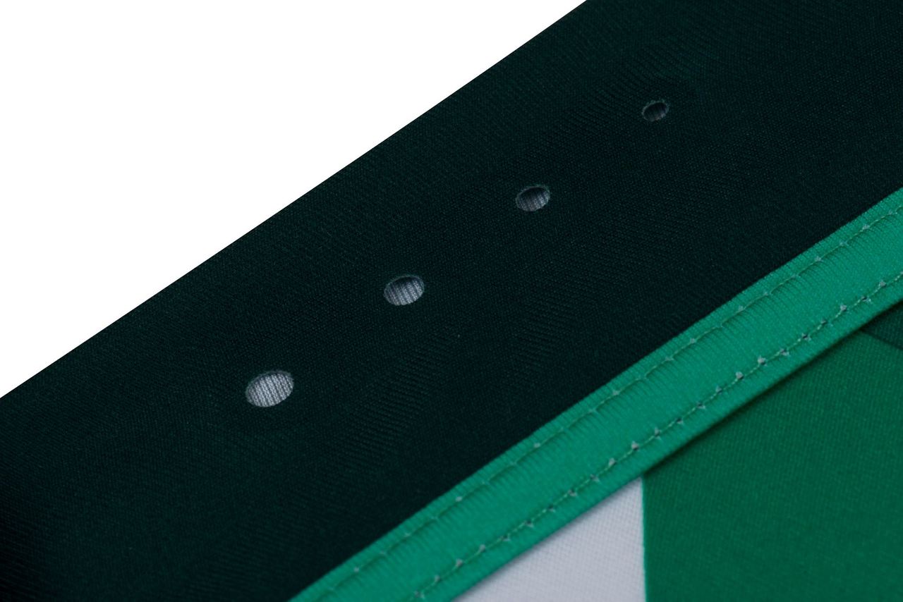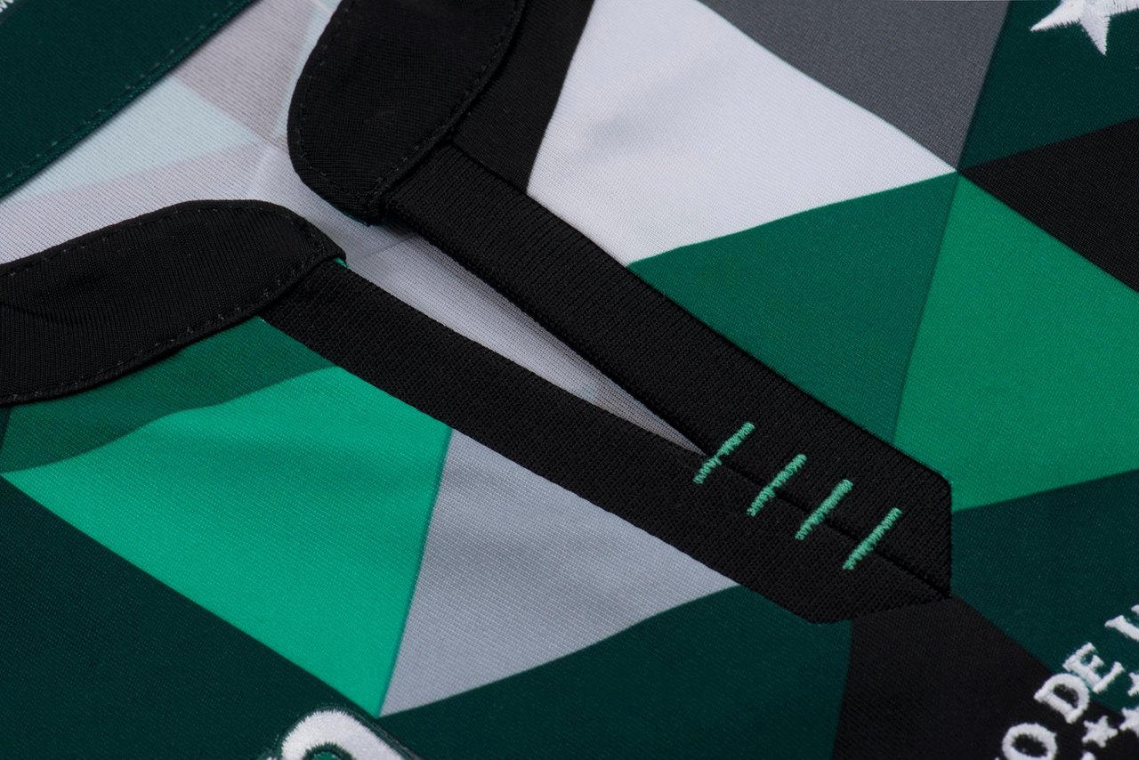 The away shirt has white as its main colour with green, black and gray triangular geometric designs on the upper part in the front and back side of the shirt. The shirt also contains micromesh inserts that give the maximum breathability to the players.