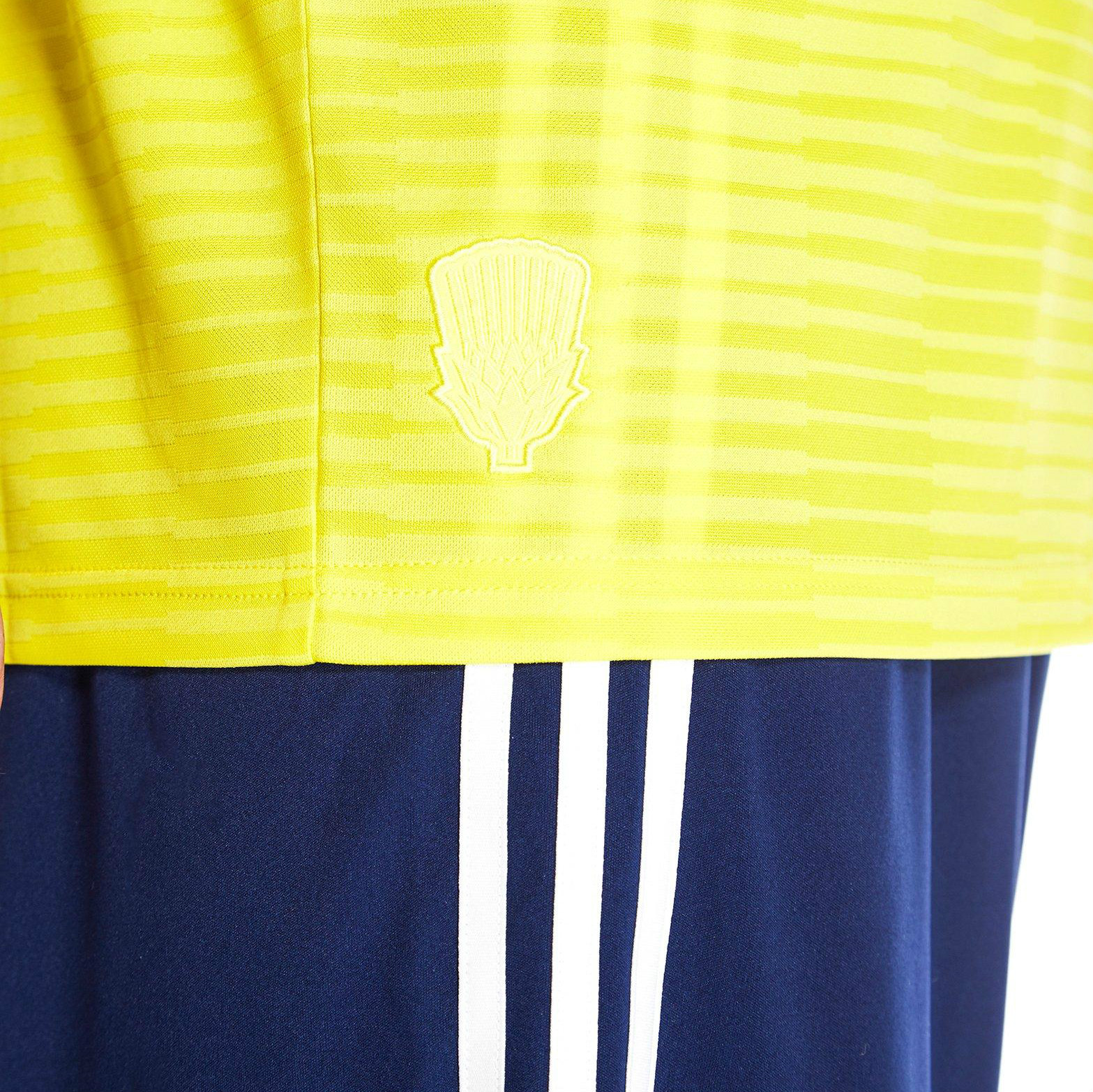 This is the new Scotland 2018 Away Shirt from Adidas. In a fresh yellow colourway, the shirt is built from lightweight, climacool fabric, which wicks away sweat to keep you feeling cool and comfortable whether on the pitch, streets or stands. It features short sleeves and is finished with signature adi branding and the iconic Scottish national crest stamped proudly to the chest.
