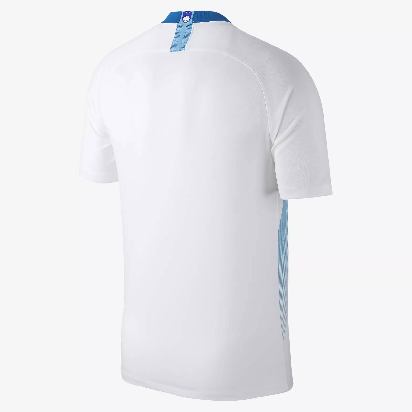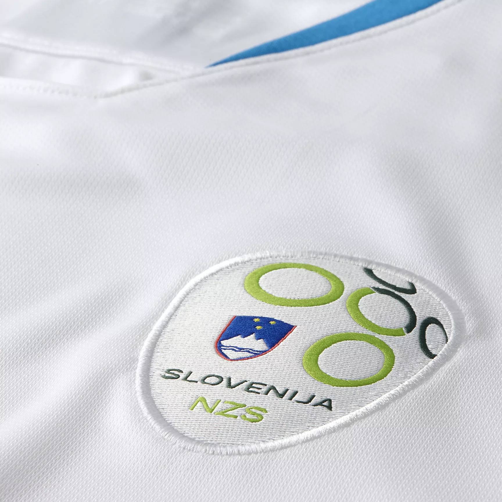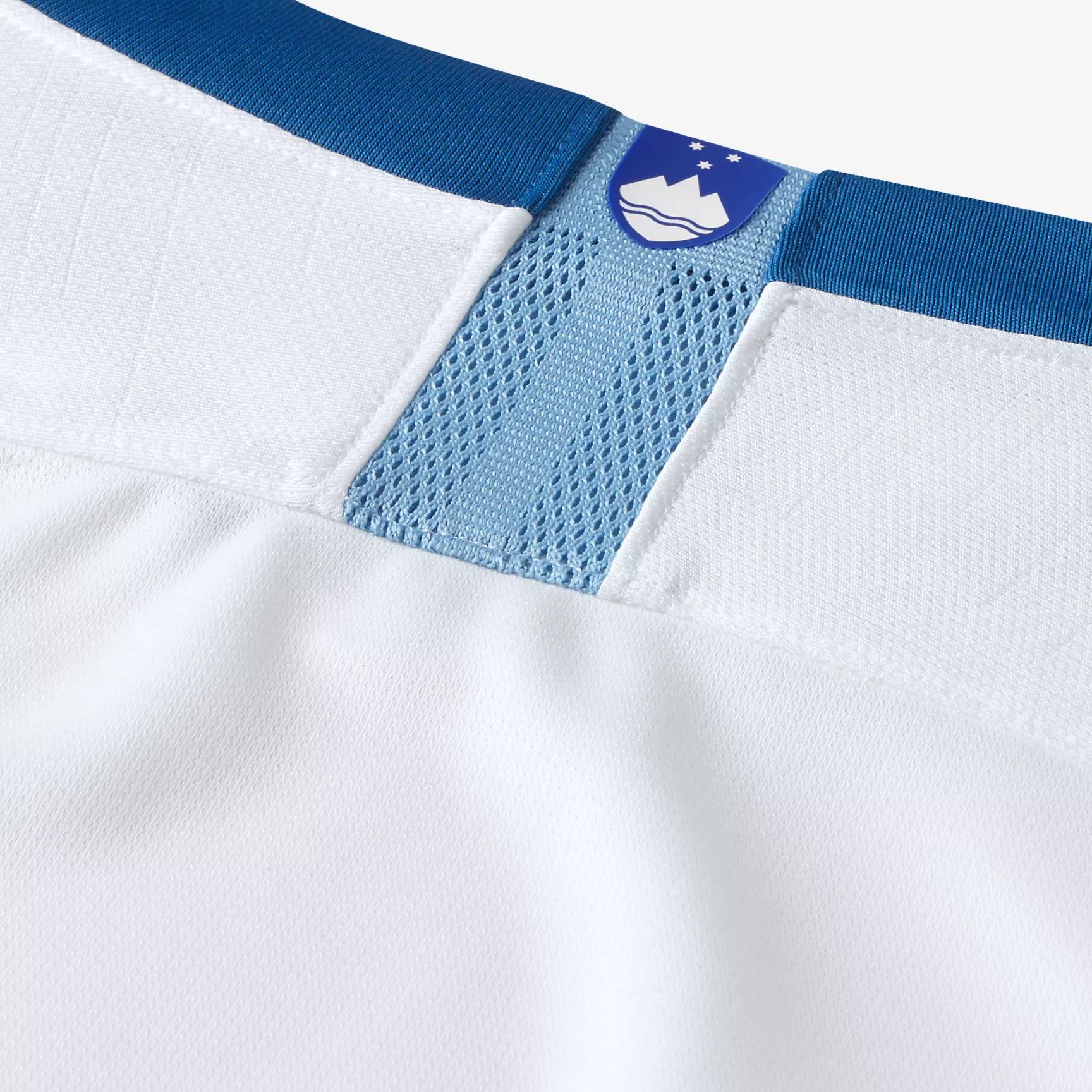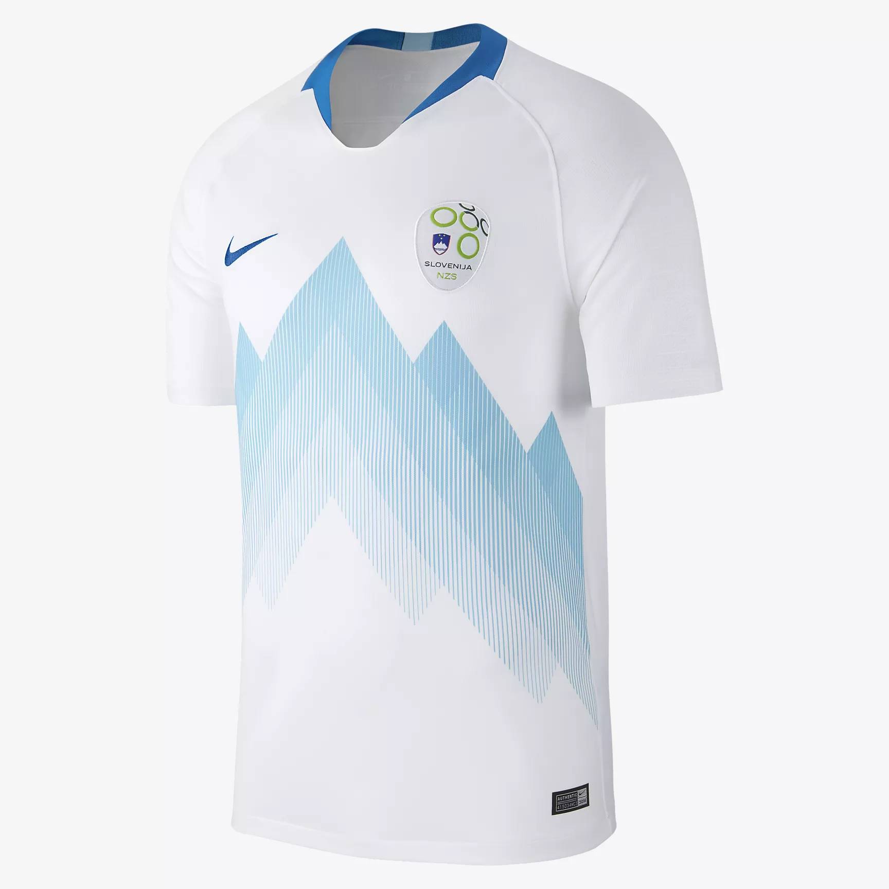 At 2,864 meters, Mount Triglav is the highest peak of the Julian Alps. It's also the symbol of the Slovene nation that forms the graphic underpinning of the Football Association of Slovenia’s new home kit, represented by a tonal blue on the white shirt.