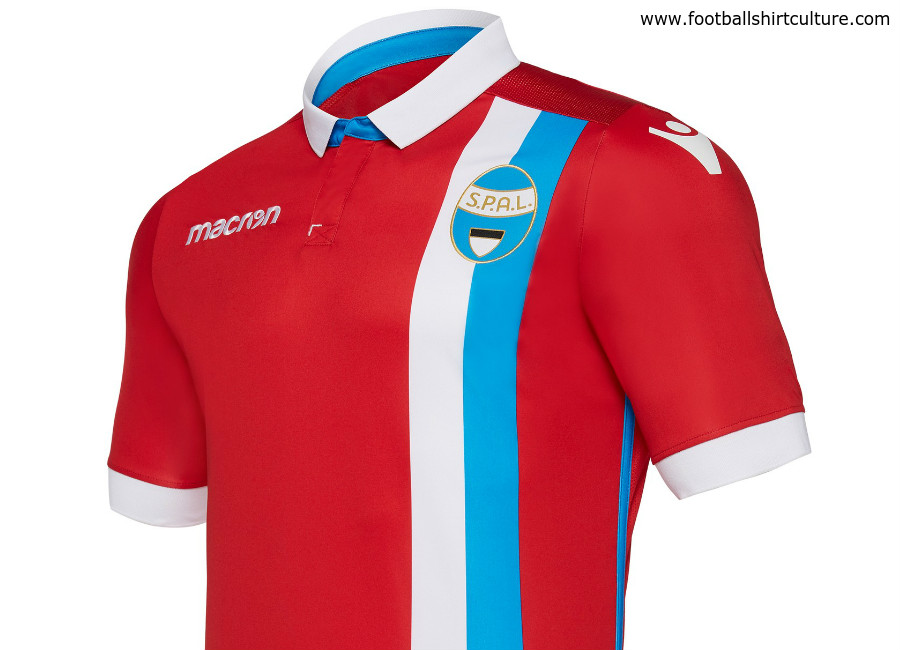 The new S.P.A.L. 17/18 away football shirt by Macron comes in red with a vertical band on the left side in the club’s traditional colours, white and pale blue.