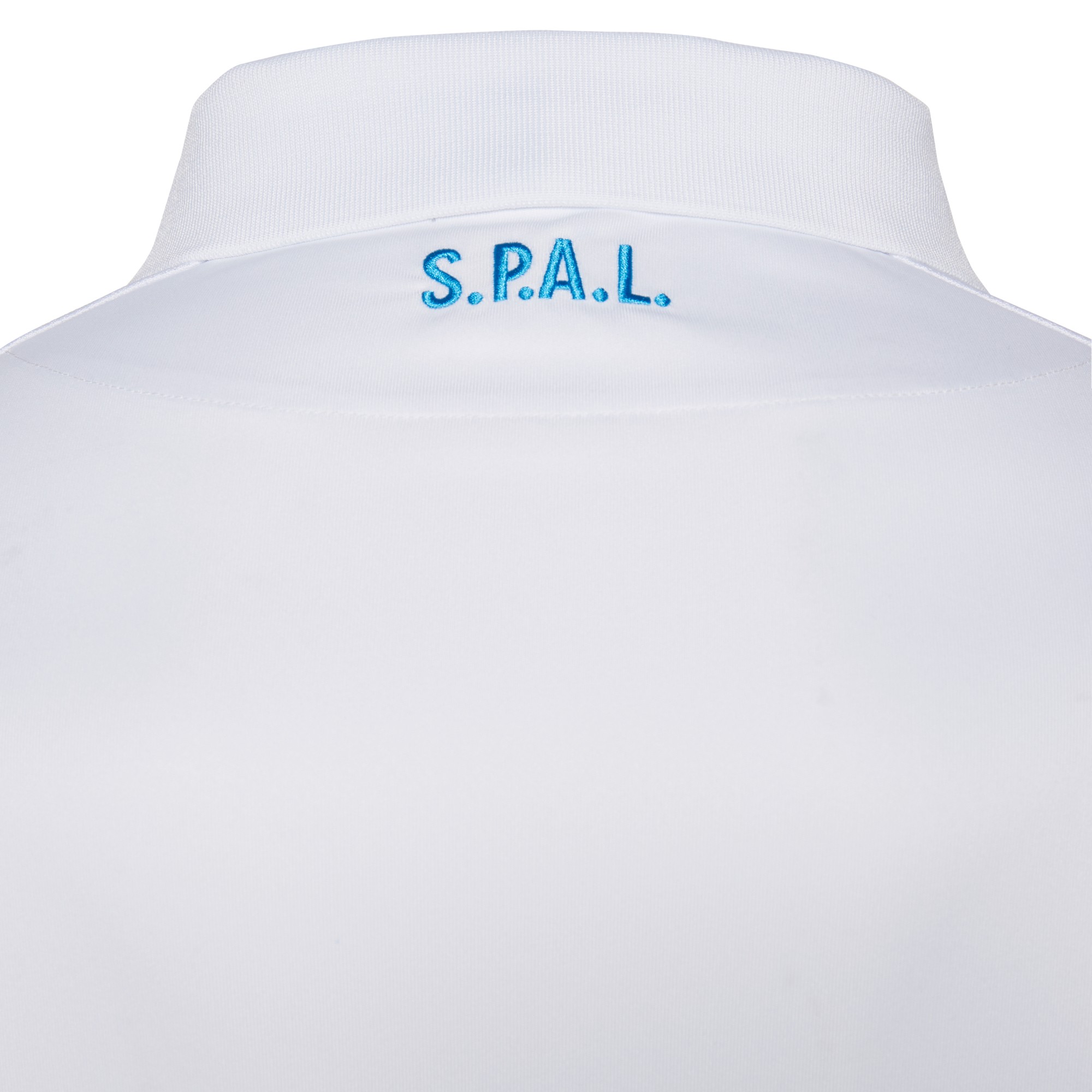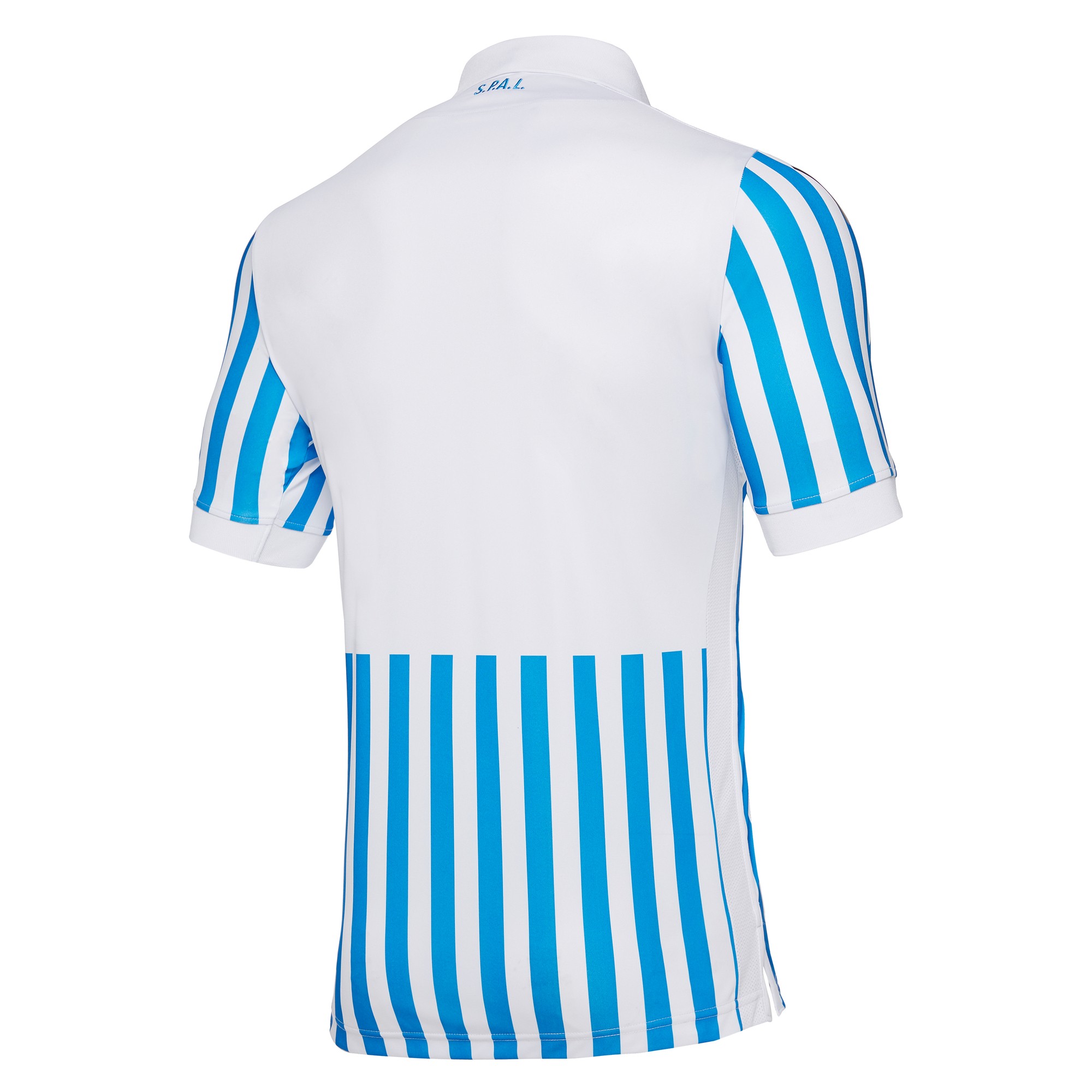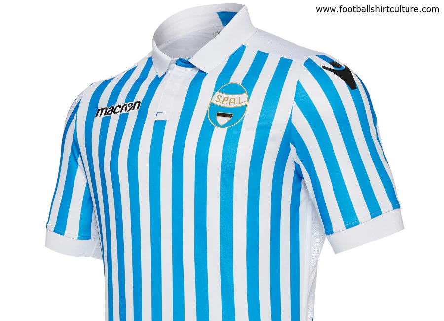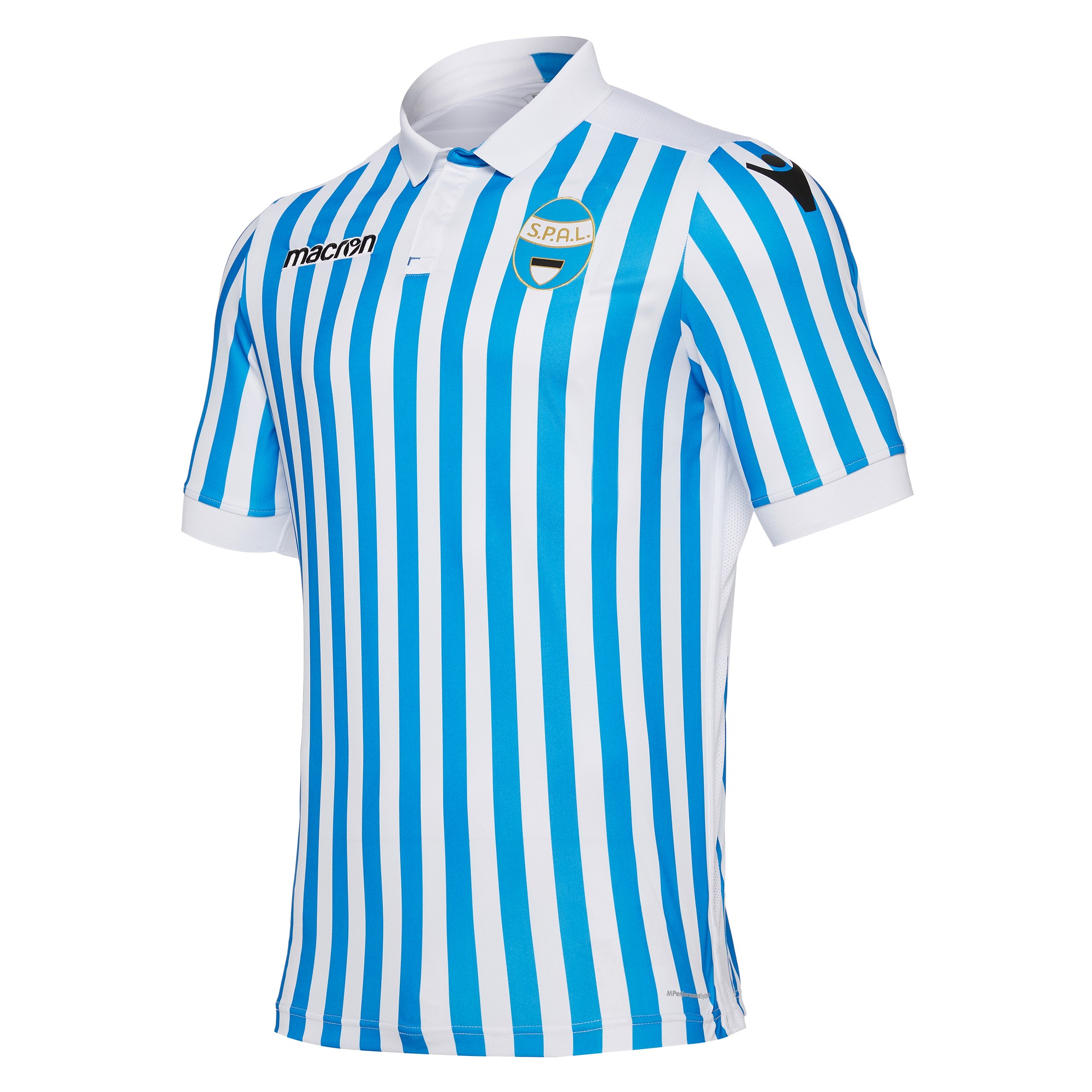 The new S.P.A.L. 17/18 home football shirt by Macron comes in the club’s traditional colours, white and pale blue, with vertical stripes.