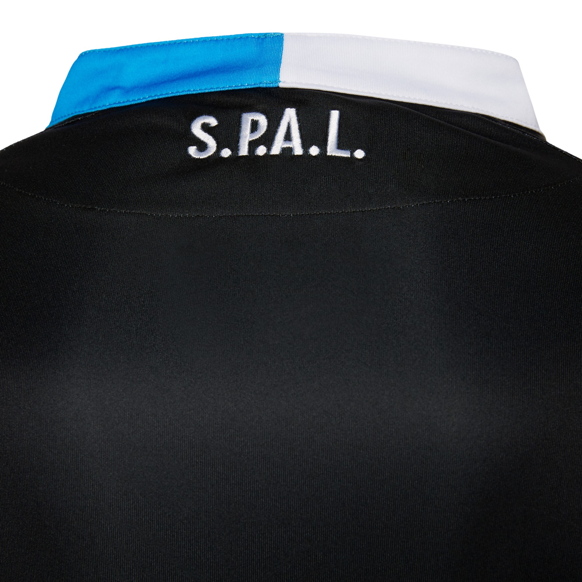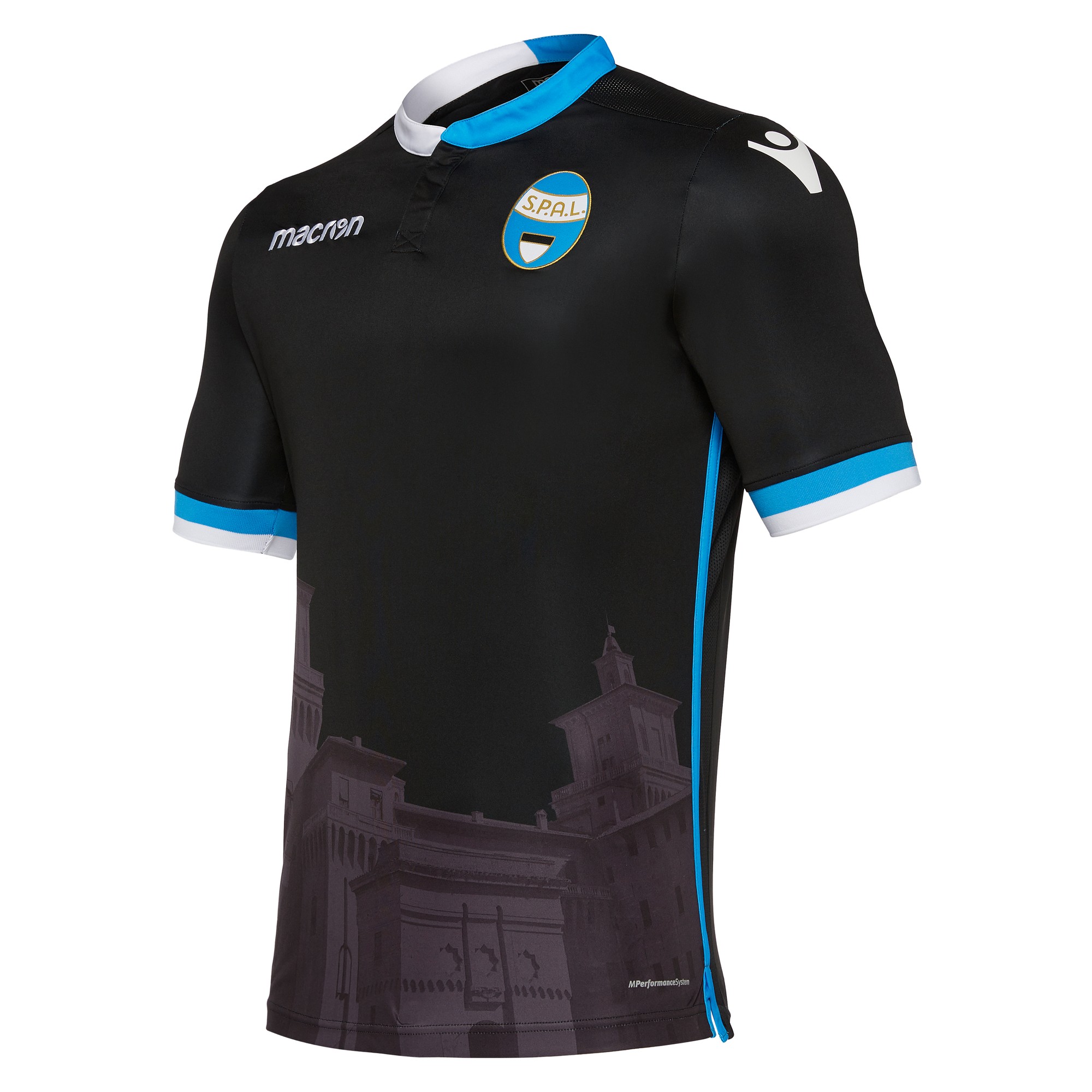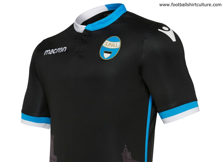 The new S.P.A.L. 17/18 third football shirt by Macron comes in black, with an enhanced texture print on the front of the shirt and white and pale blue details.