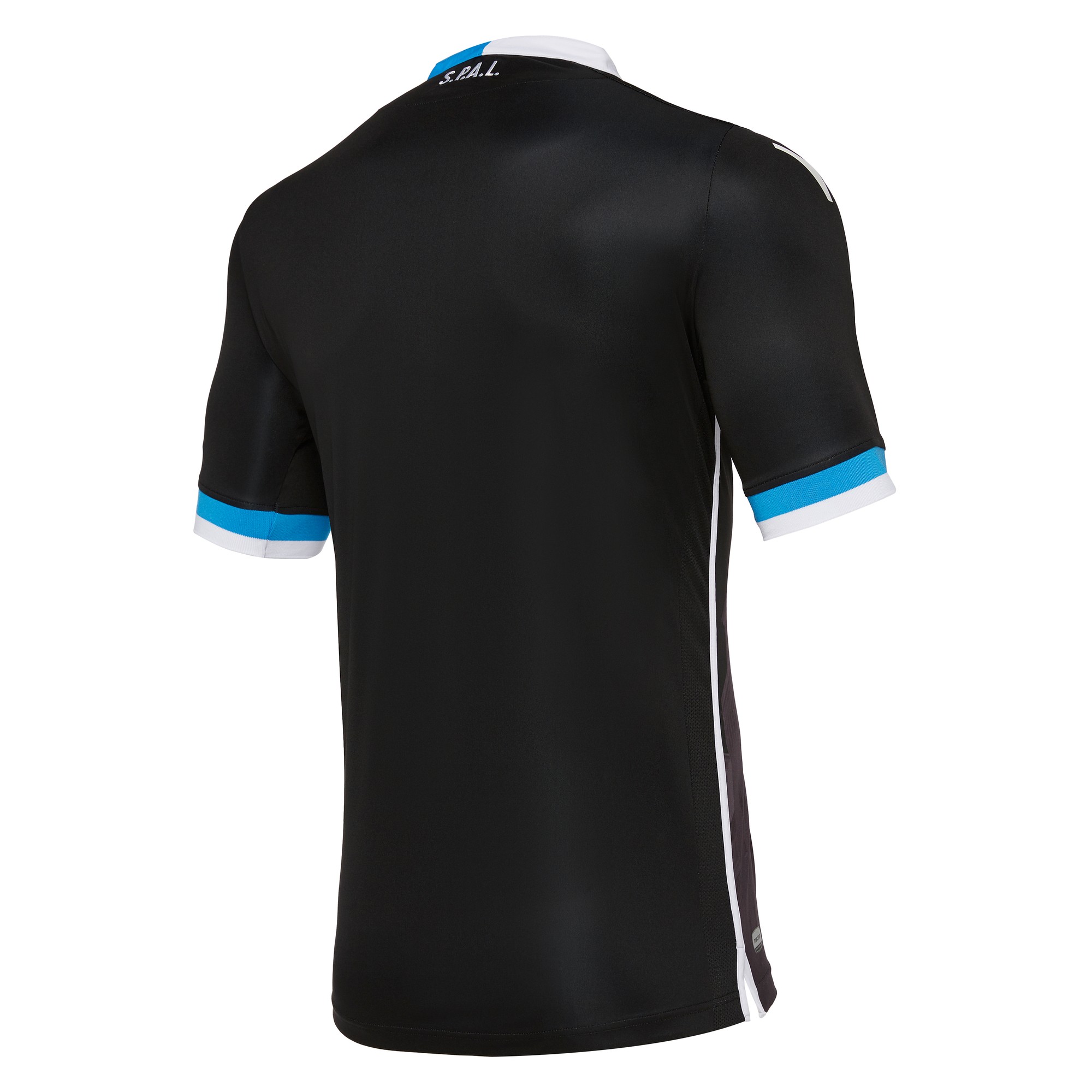 There is a white Macron Man logo on the shoulders. The collar and sleeve cuffs are knitted, and the sides have mesh inserts guaranteeing breathability. The word 'S.P.A.L.' in white is embroidered on the back of the shirt, just under the collar.