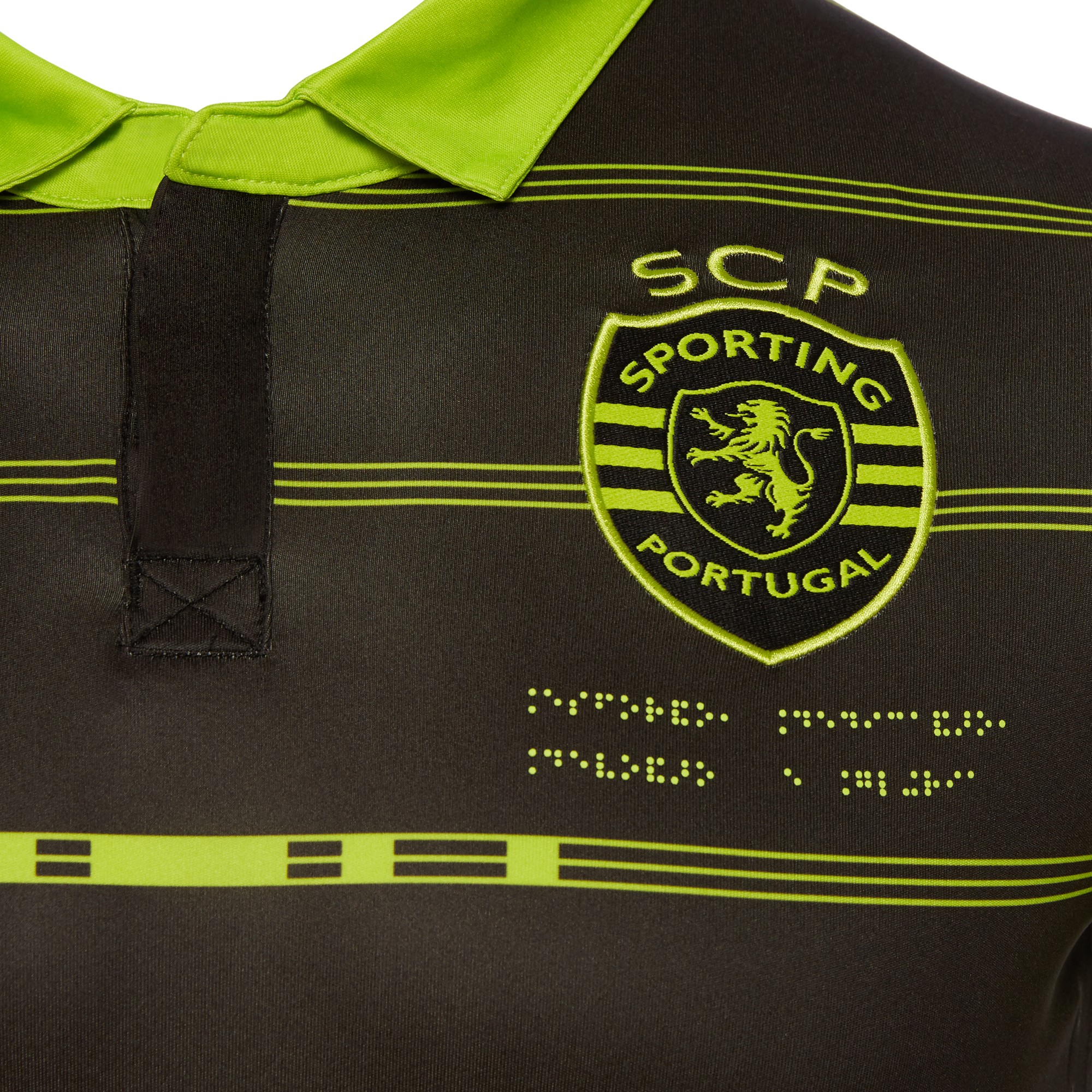 The Macron Man is printed in black on the lime yellow sleeves. The Macron logo stands out in lime yellow on the top right-hand side of the front of the shirt, while the left-hand side carries the single-coloured Sporting Clube de Portugal badge, and just below this the club logo in Braille.