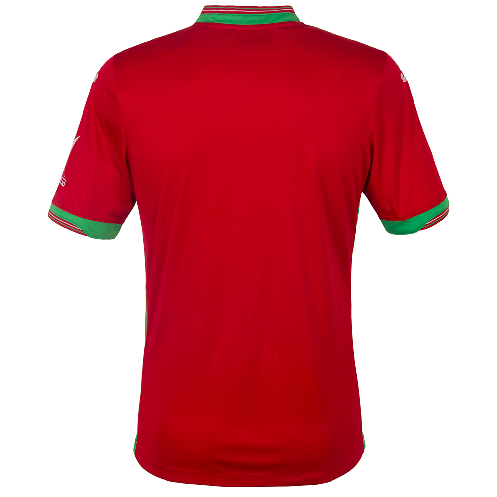 The chilli red away jersey, featuring a subtle striped pattern, is completed with green mesh side panels and ribbed red, green and white cuffs and collar - the true colours of Wales.