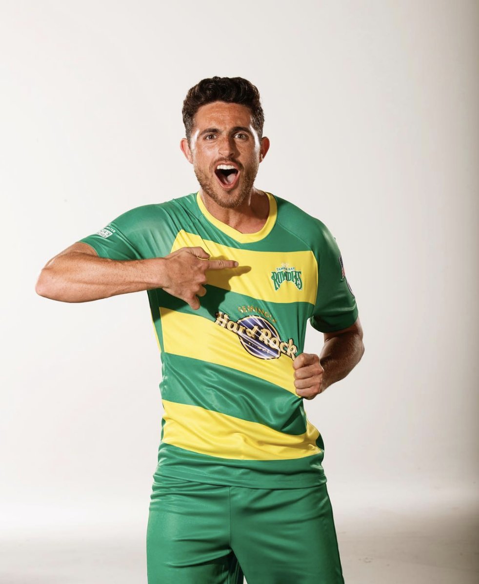 The green and gold hooped home shirt features the Seminole Hard Rock Hotel logo across the chest and a Visit St. Petersburg Clearwater logo on the sleeve.