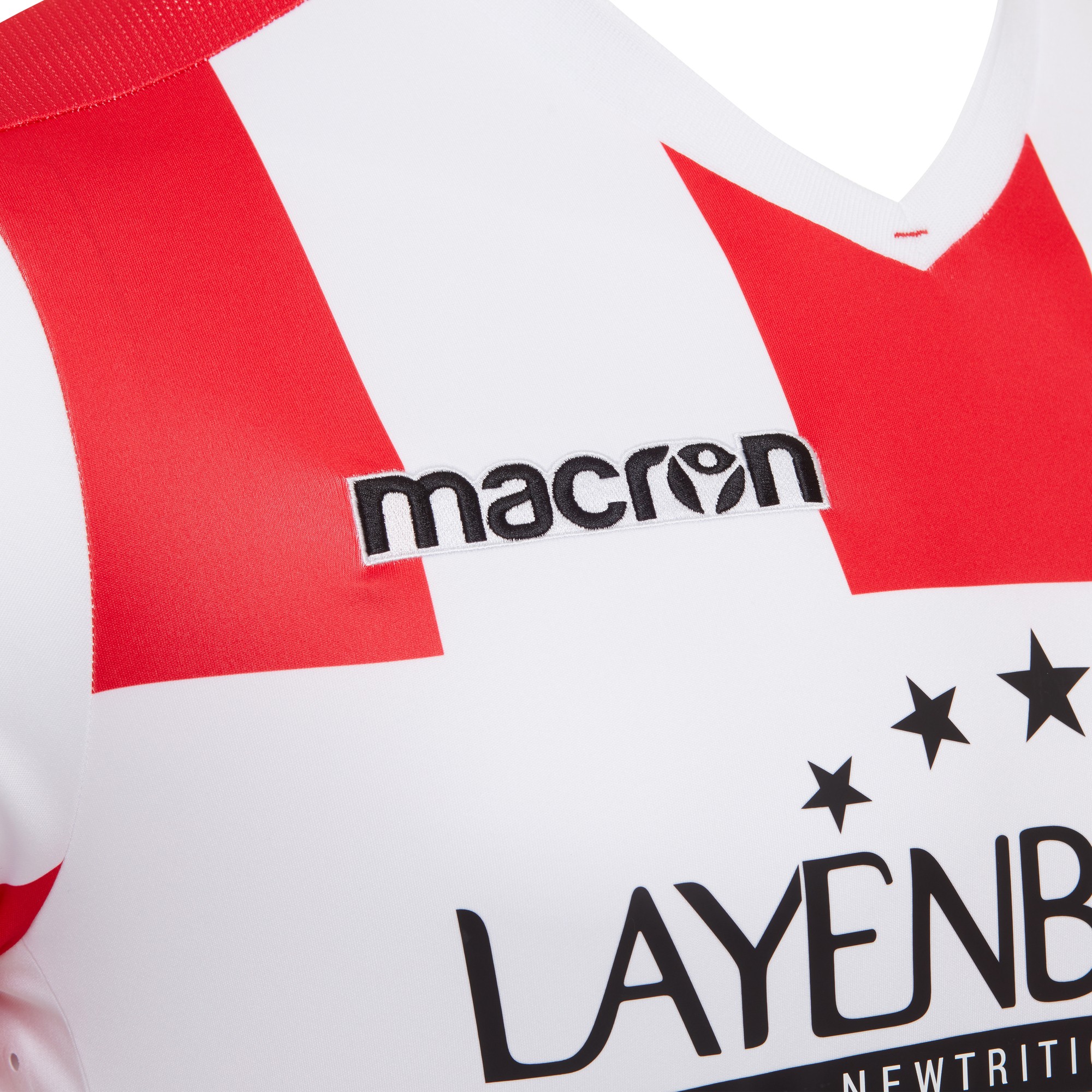 The shoulders and sides feature laser-cut mesh inserts for a comfortable, cool sensation and ventilation. The Macron logo in black is displayed on the top right-hand side on the front. The left-hand side carries the badge of this German club. The FC Union Berlin home shirt embodies the club's passion and commitment, as worn by the footballers on the field.