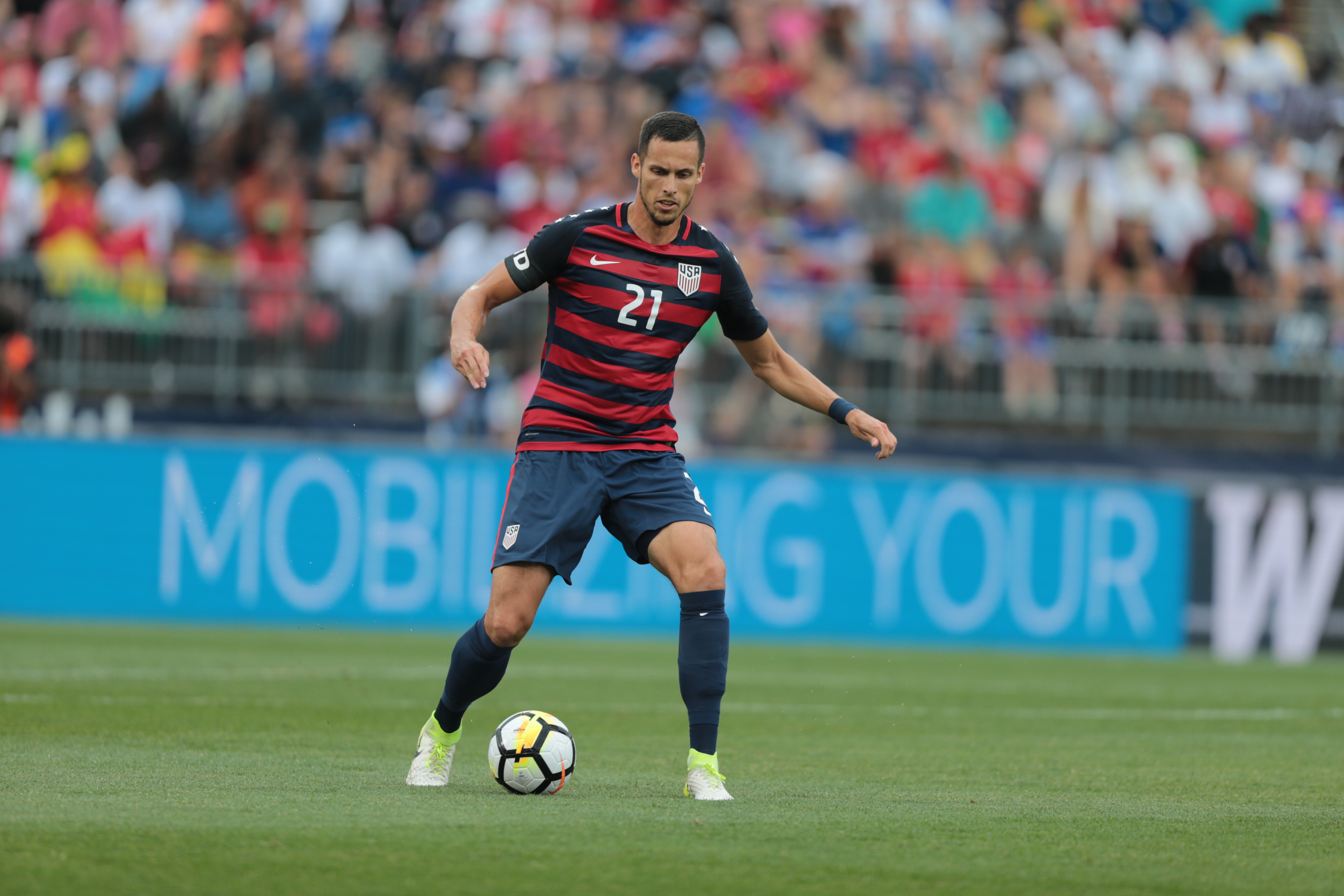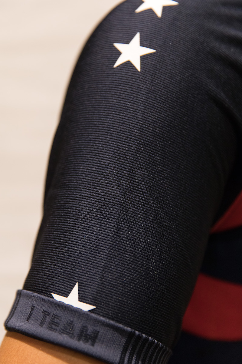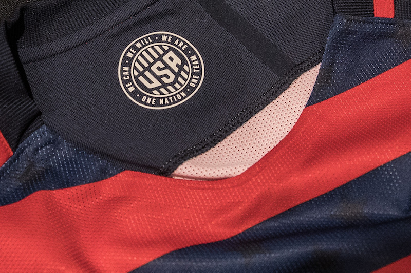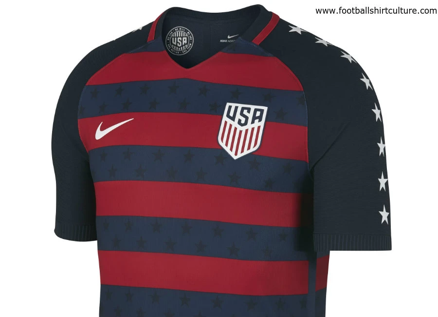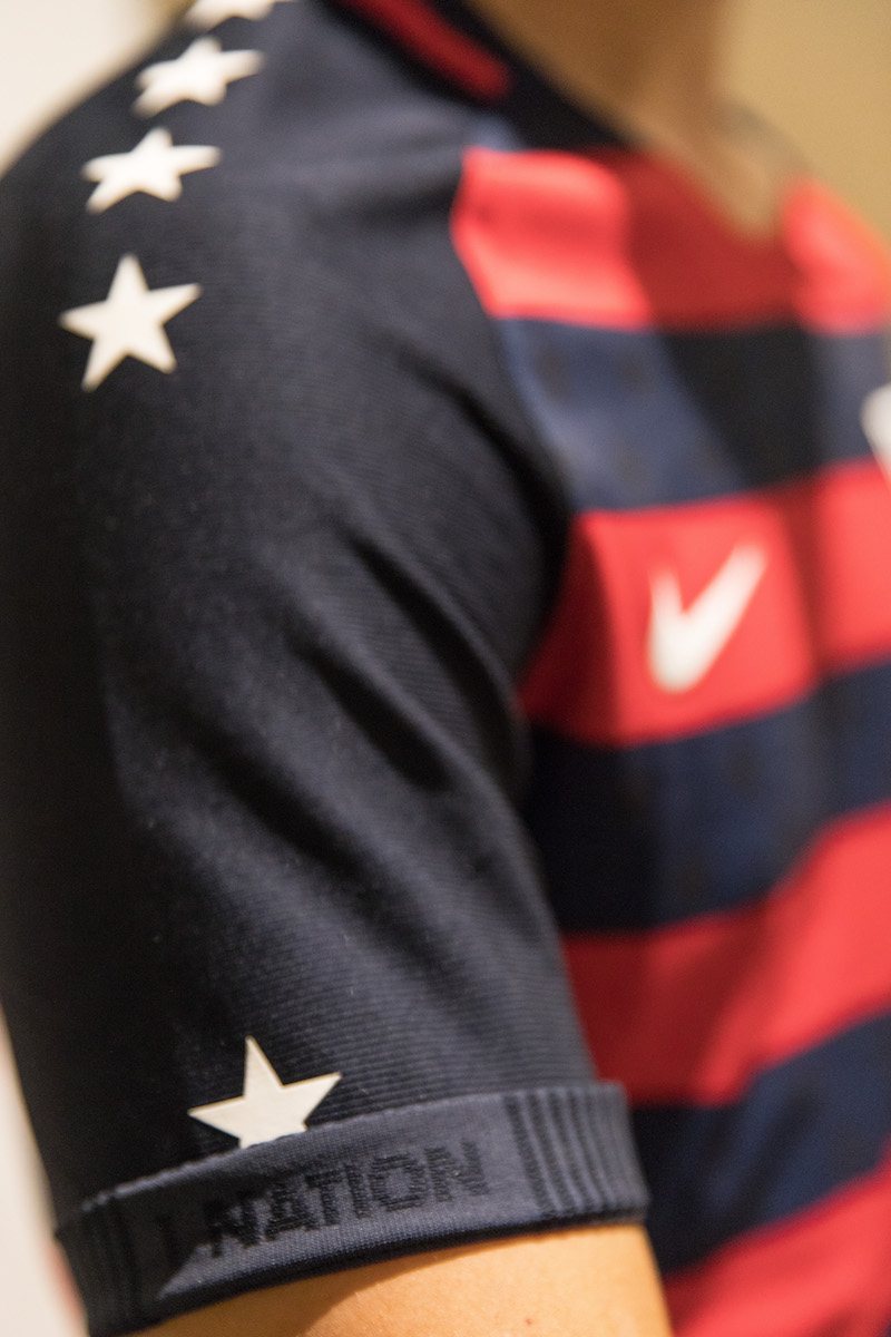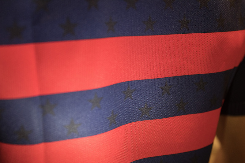 The kit features distinctly American design elements: bold red and navy stripes across the body of the shirt and tonal obsidian stars throughout. White silicon printed stars line the shirt sleeves, reinforcing the undeniably American characteristics of the kit.