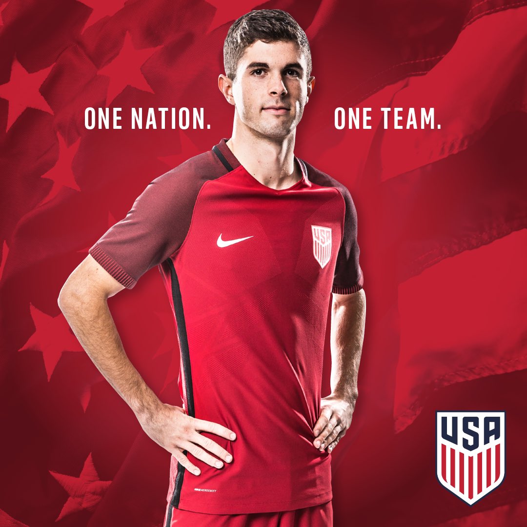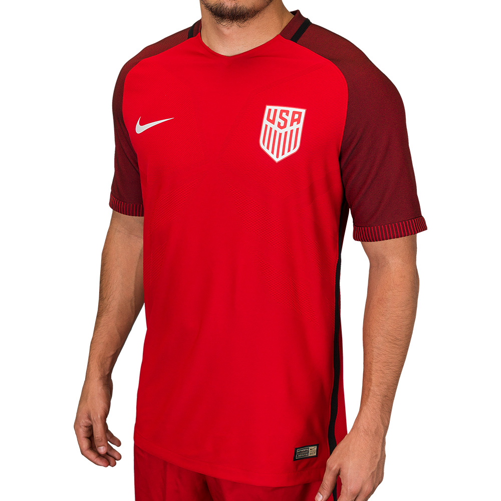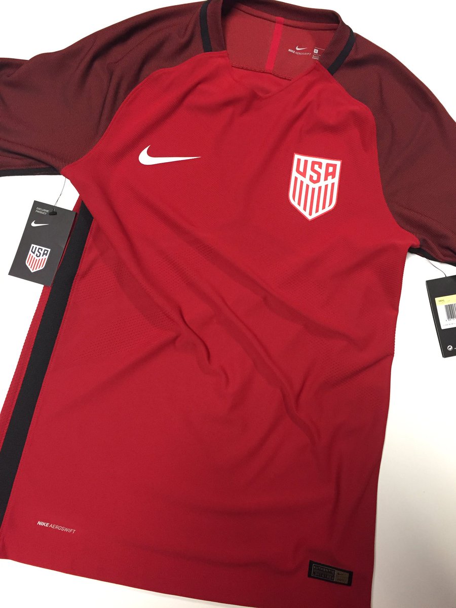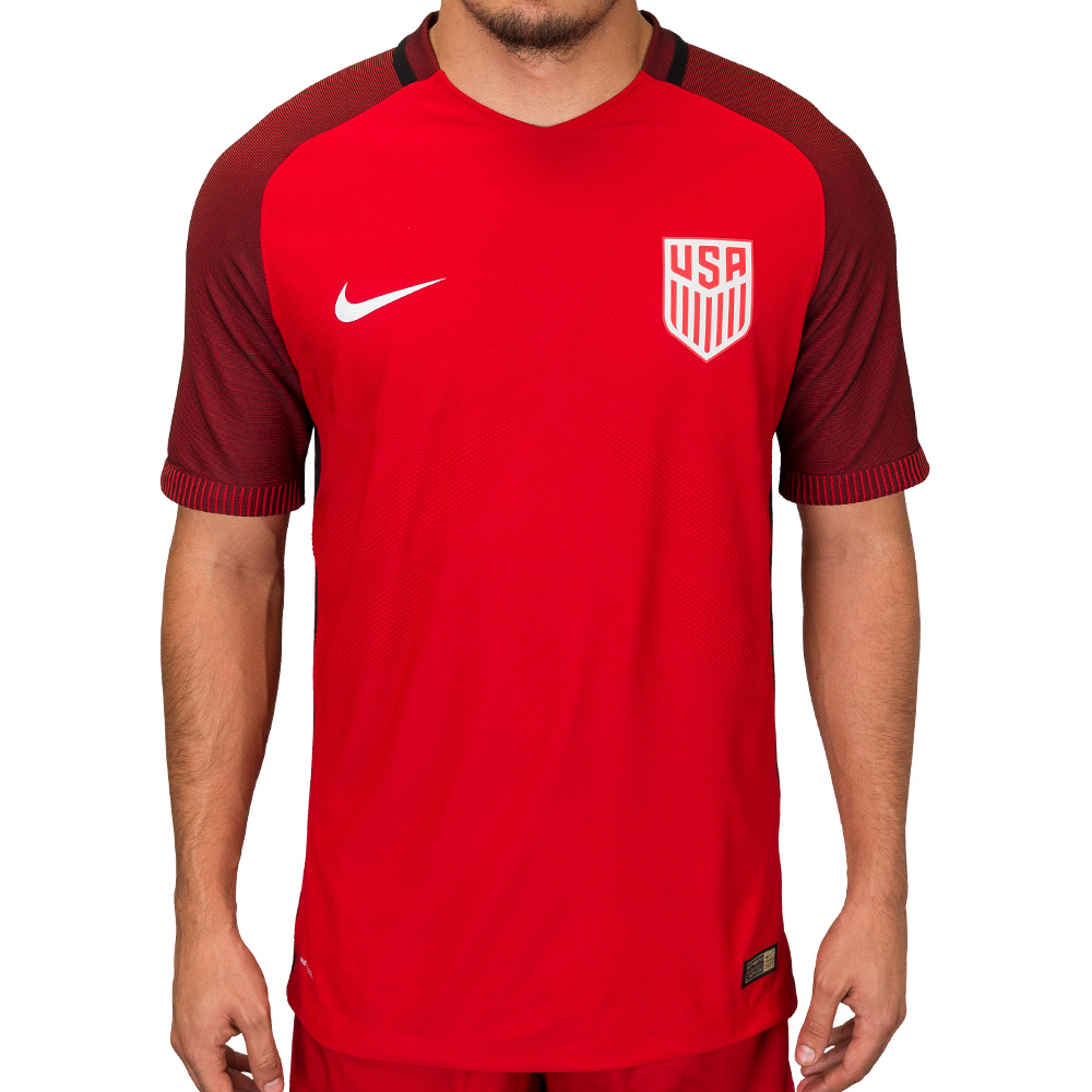 Similar to the current home jersey, the red jersey is adorned with several patriotic flares throughout the material, including “1 Nation” and “1 Team” on the inside cuffs of the sleeve, in addition to “USA” displayed on the neckline. The slim cut provides a distraction-free fit while preserving range of motion. The USA crest and the Swoosh logo are heat transferred for a flexible, breathable finish that does not interfere with athlete performance.