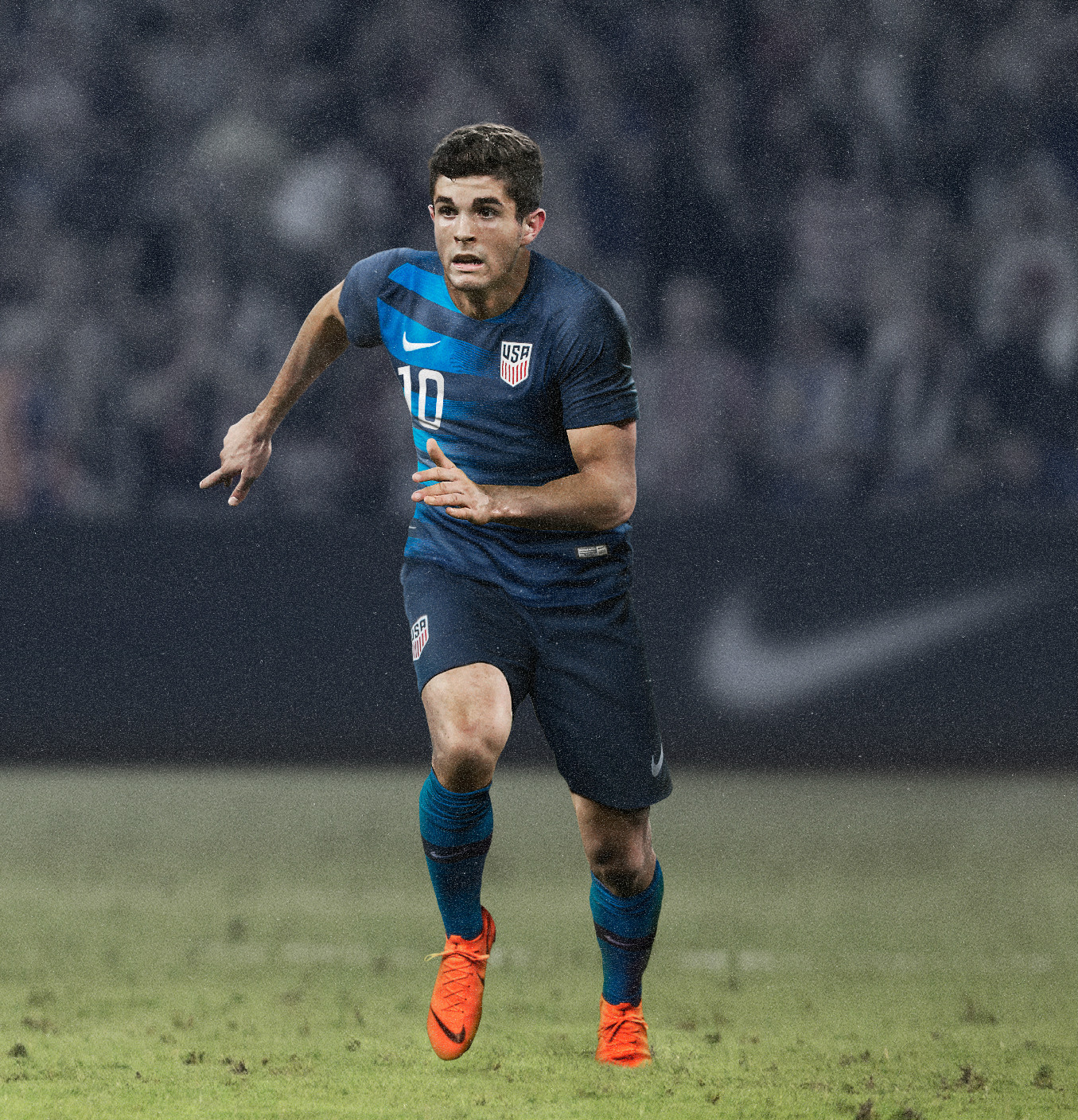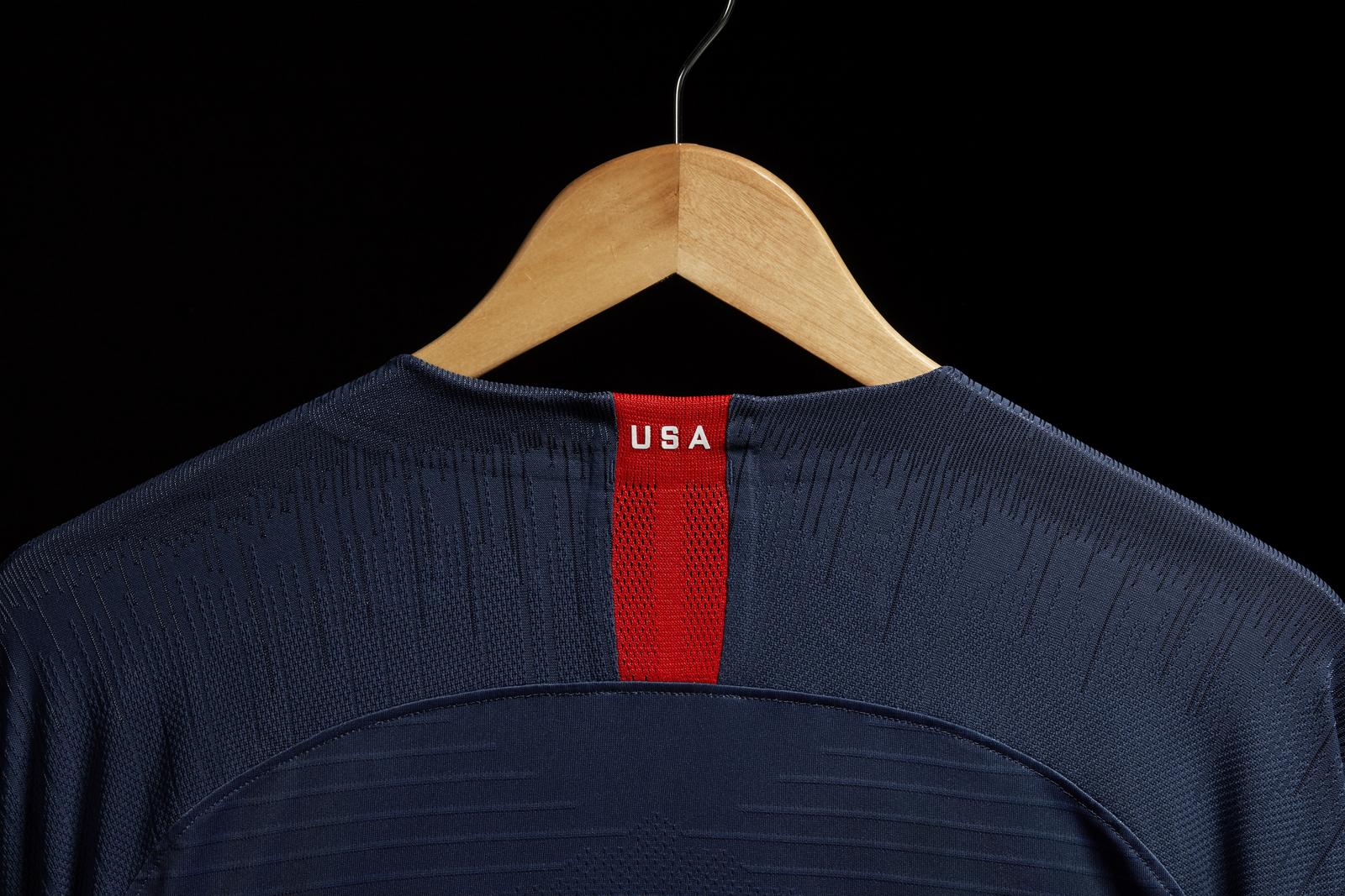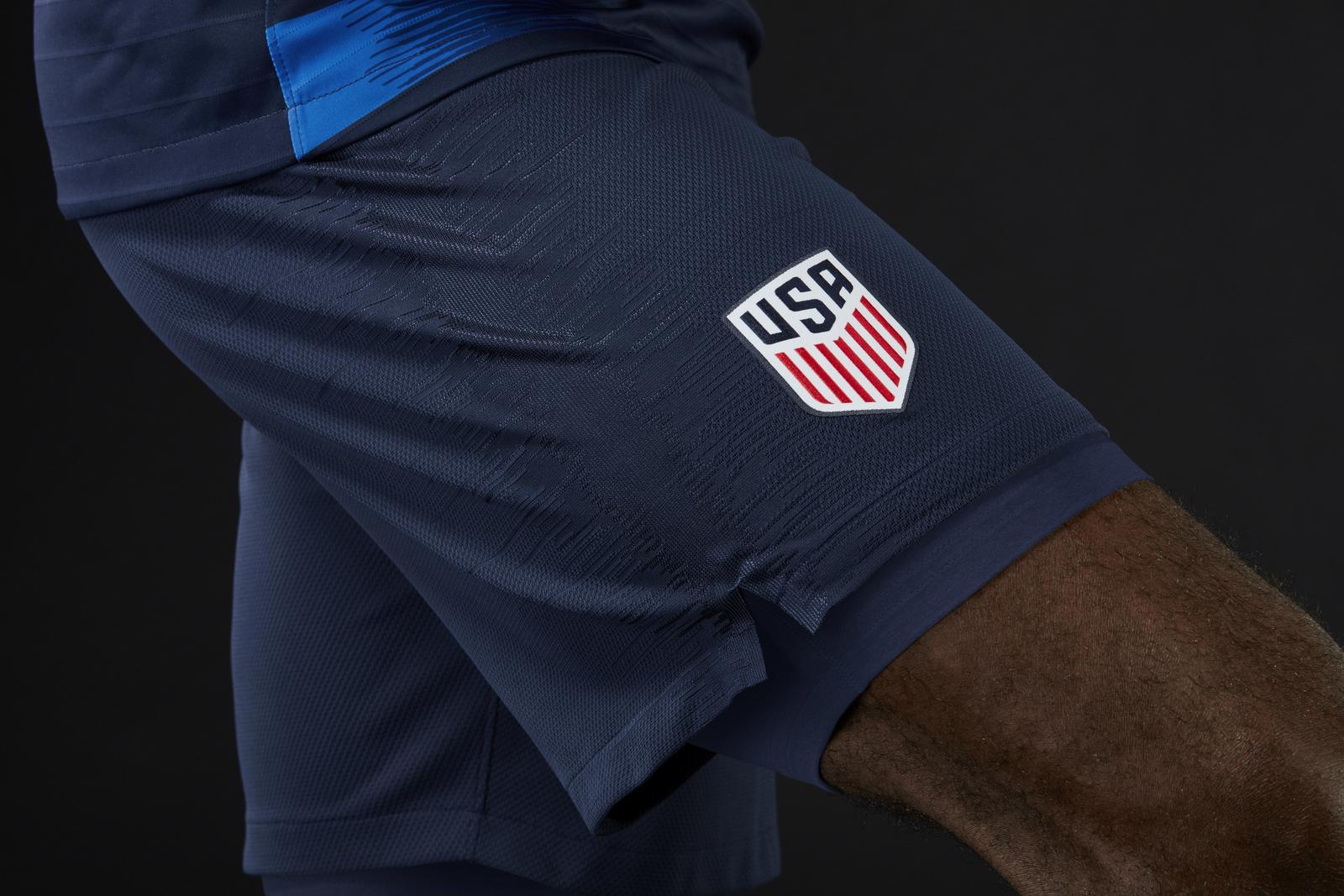 While the inspiration of the home kit is grounded, the United States 2018 away kit reflects excitement in embracing the unknown through gesture to space travel (most notable in the inner pride badge) and sleek, negative shaping of the stripes.