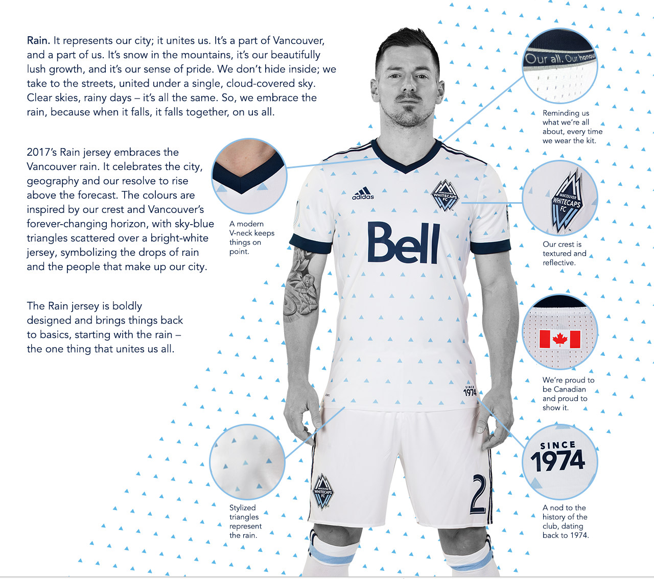The 2017’s Rain jersey embraces the Vancouver rain. It celebrates the city, geography and our resolve to rise above the forecast.